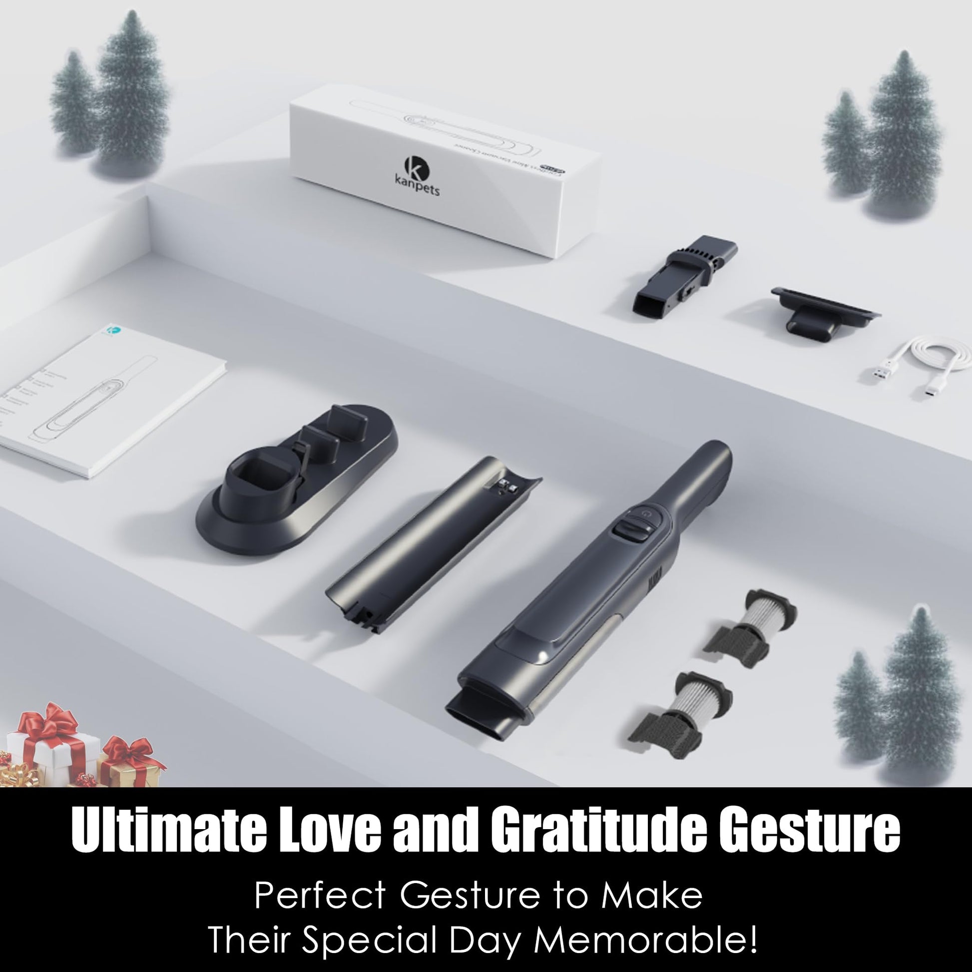 - Ultimate Love and Gratitude Gesture: 1x KANPETS Handheld Vacuum, 2x H13 HEPA Filter (One installed), 1x Duster Crevice Tool, 1x Multi-Surface Pet Tool, 1x Charging Plate, 1x Accessory Storage Dock, 1x Type-C Charging Cable, 1x User Manual, 1x 12-months Warranty.