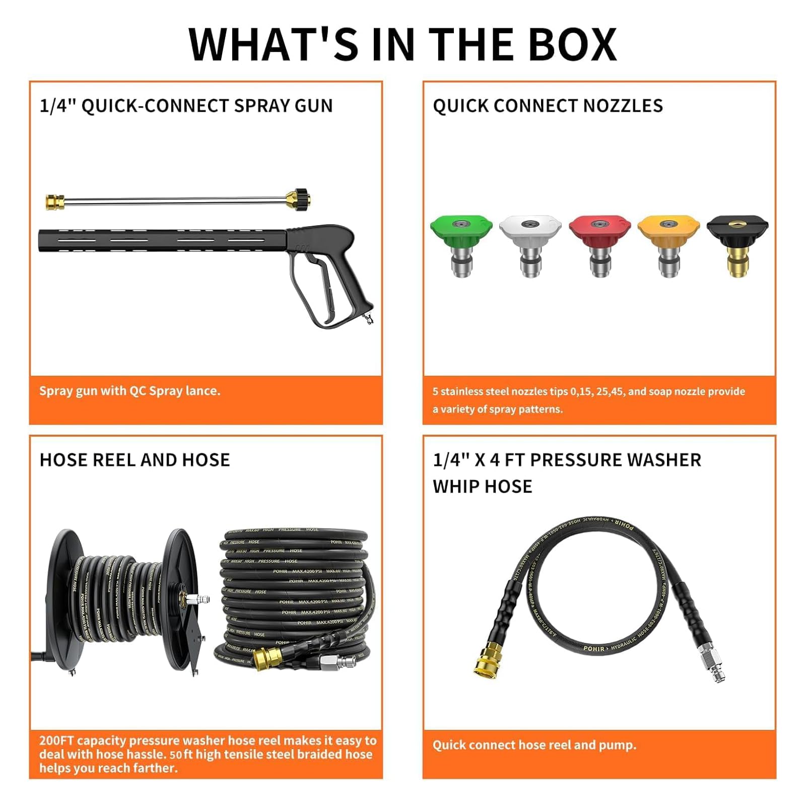 - PREMIUM ACCESSORIES INCLUDED: Comes with a 50-foot, 3/8' wear-resistant, ultra-flexible high-pressure hose, a lightweight high-pressure spray gun and extension wand, and 5 quick-connect nozzles (0°, 15°, 25°, 40°, and soap nozzle).