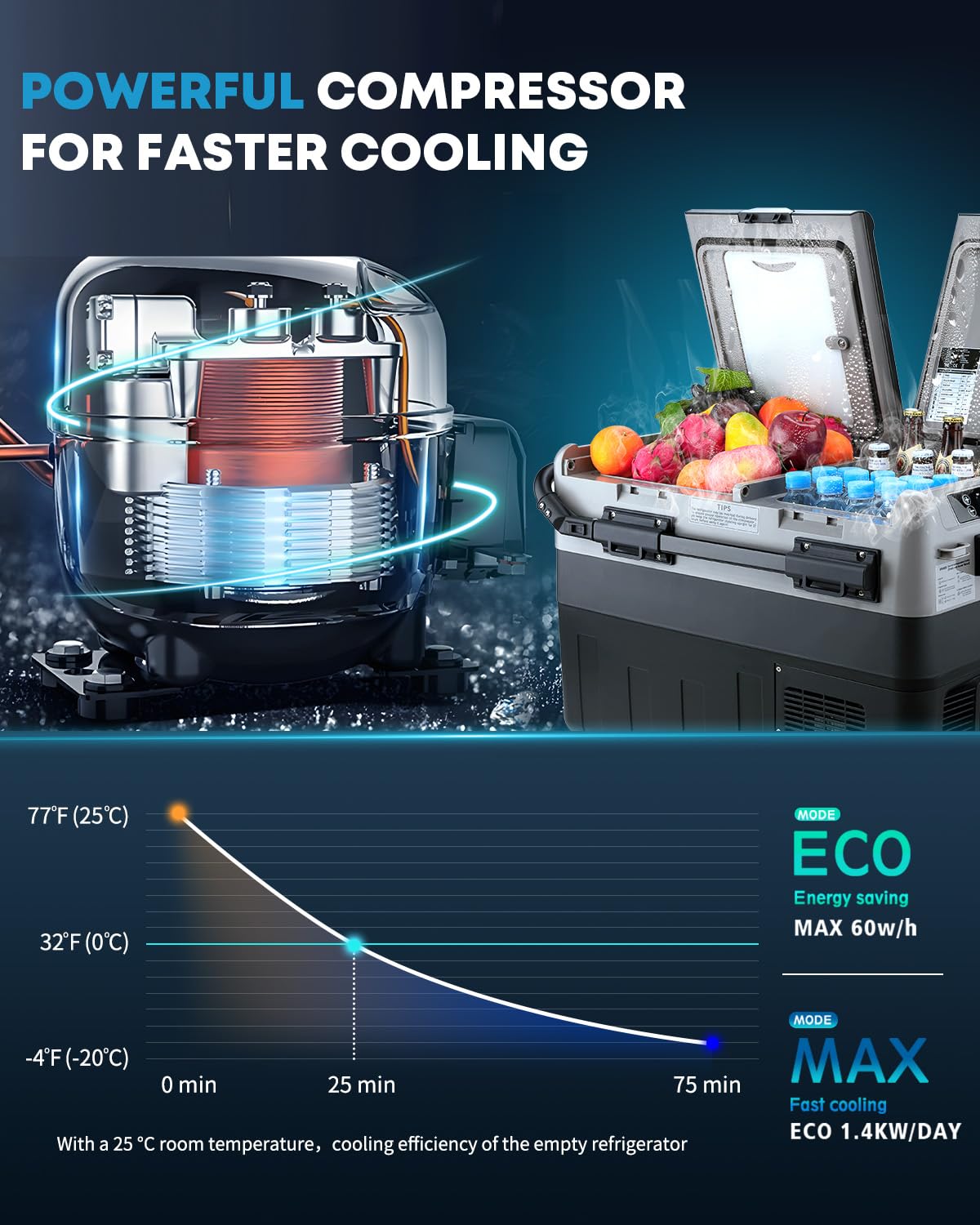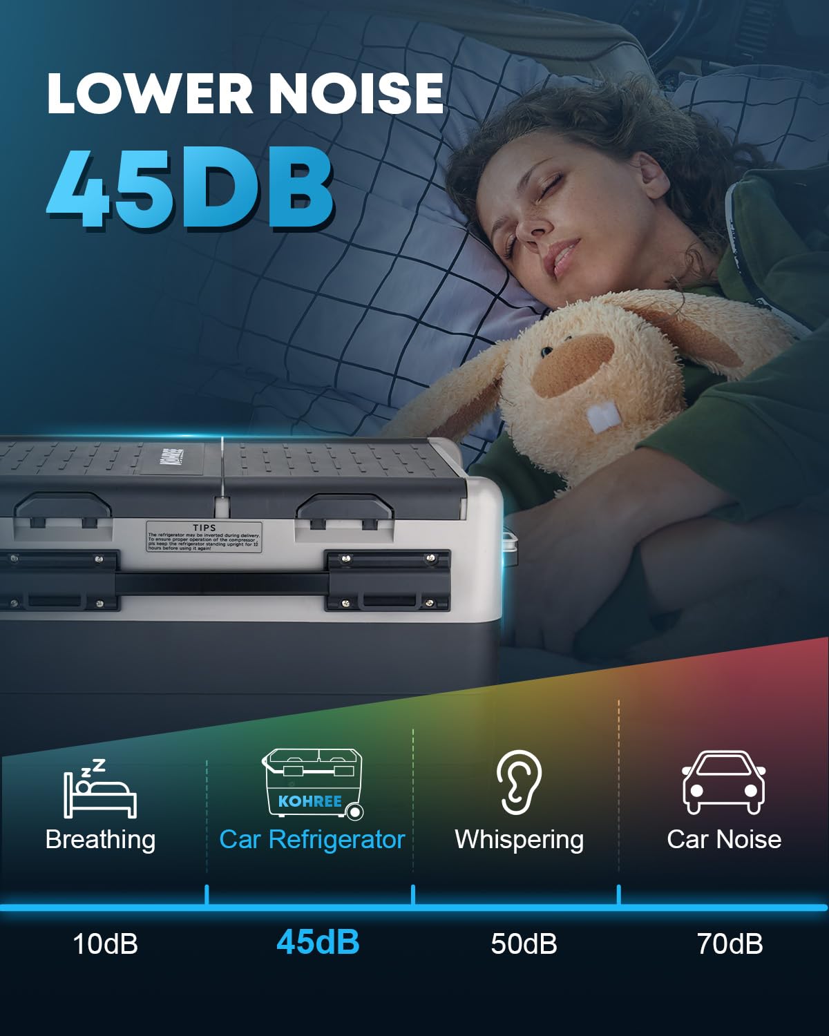 - 【Dual Storage Zone Car Refrigerator】Kohree portable refrigerator is equipped with two zones--Large zone 30L (31Quart), small zone 10L (11Quart). You could control the temperature of the dual zone independently, preventing the odor of ingredients and the temperature of each zone from affecting each other. This large 12v refrigerator allows you to store seafood, snacks, meat, and beverages during travel, boating, and camping trips.