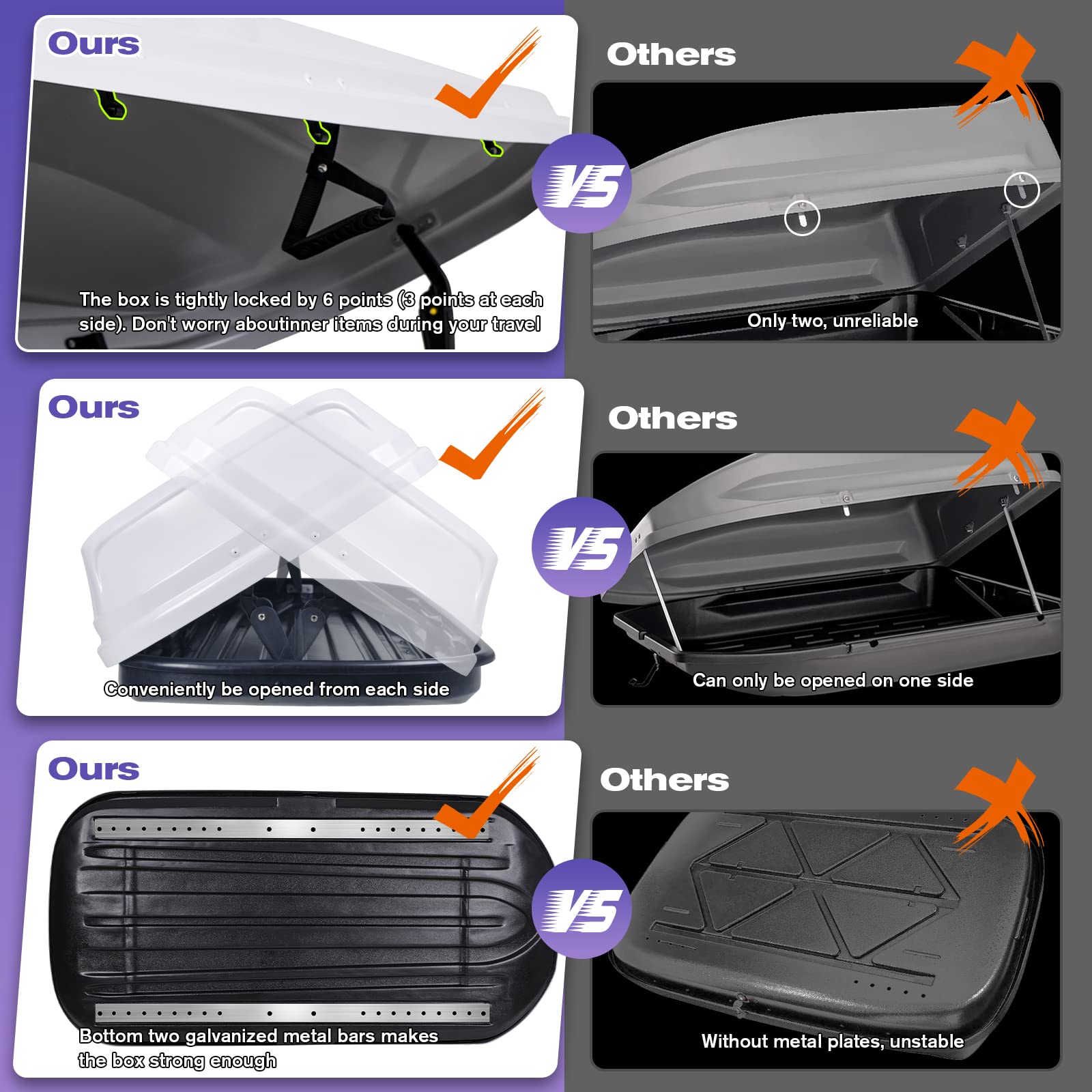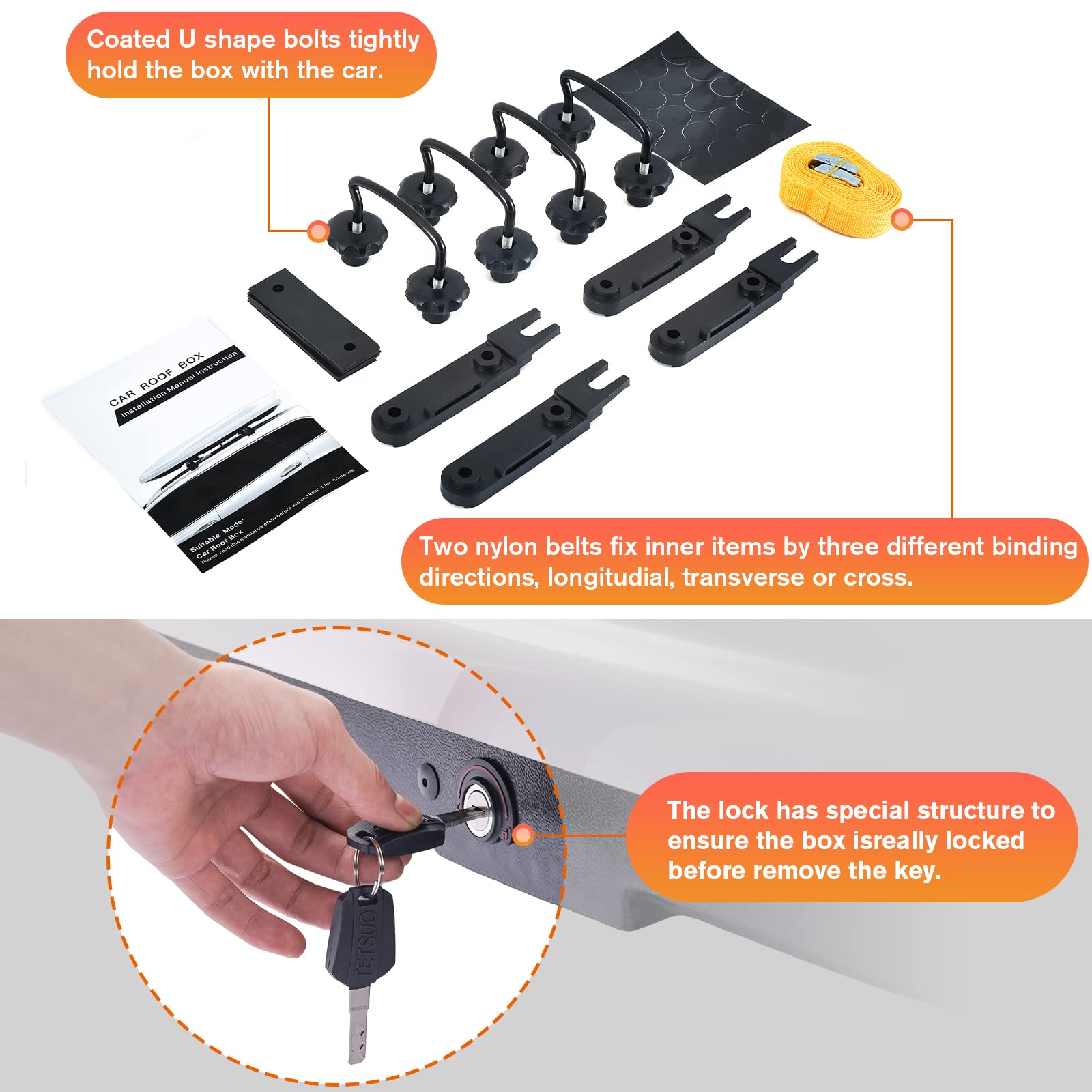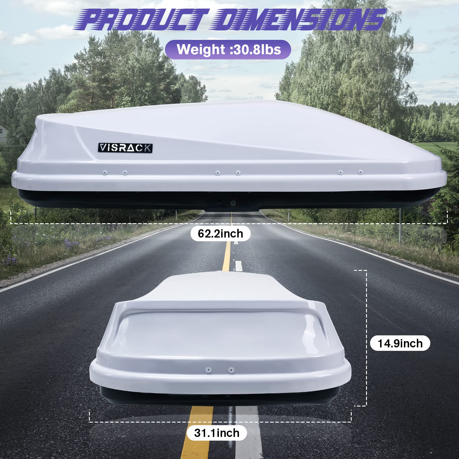 - [Ample Storage]: 14 Cubic Feet storage with 61.81” (L) X 31.5” (W) X 14.17” (H). Provides significant additional storage space on the roof of your car, allowing you to transport large or bulky items such as luggage, camping gear, or sports equipment.