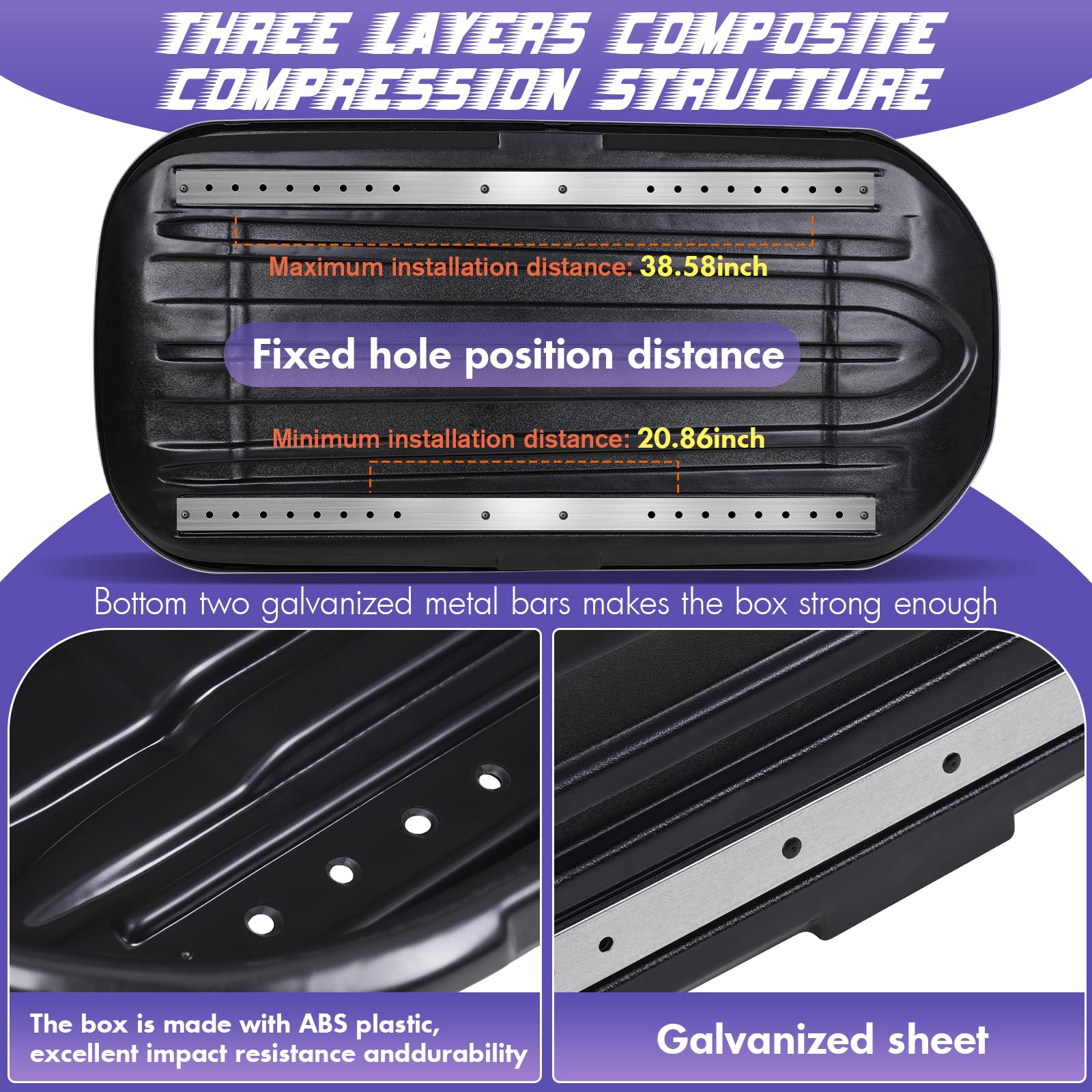 - [High Quality Material]: This car roof box is manufactured from sturdy ABS and PMMA material for long-lasting use and shiny, able to protect your valuables from exposure to the elements and can load 130 lbs capacity, suitable for round, square and most aerodynamic bars.