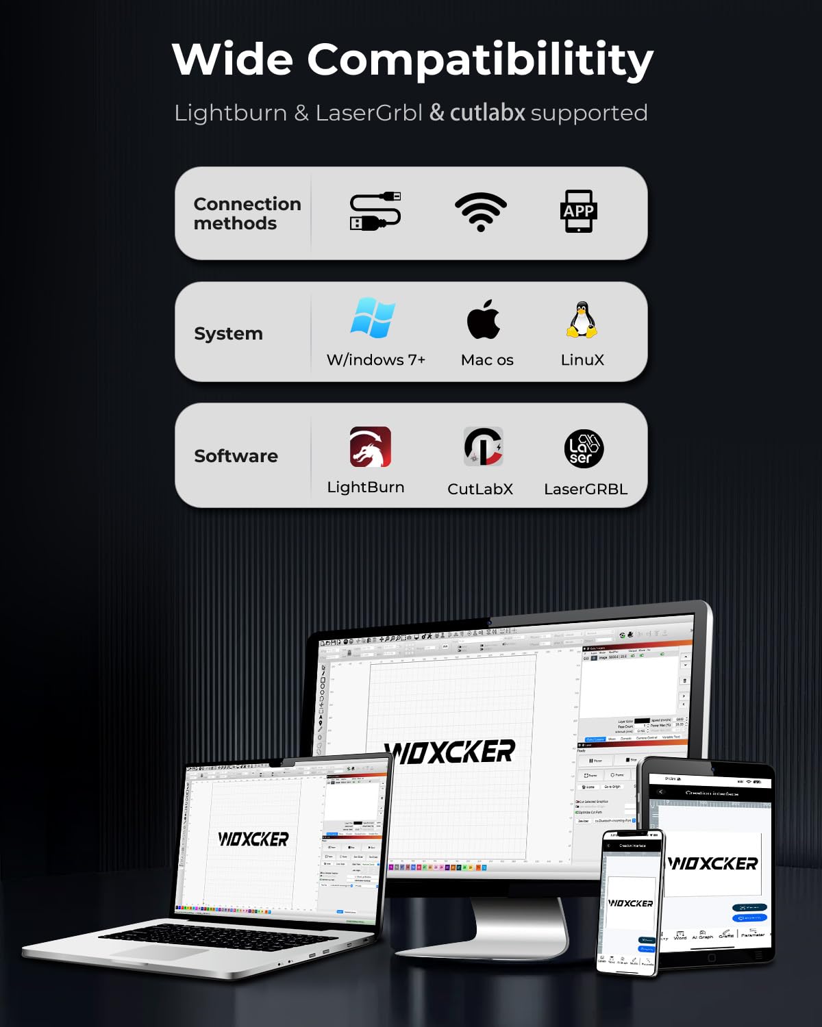 - Perfect Compatible System: The laser engraving machine boasts extensive compatibility with various software and connection options. It supports popular software like LightBurn, LaserGRBL, and Cutlabx, and offers multiple connection methods, including Wi-Fi, USB cable, APP, and offline via TF card. The machine is compatible with a wide range of file formats, such as JPEG, JPG, PNG, BMP, SVG, DXF, and AI. Users can take and load photos for engraving, use built-in graphics, and edit text directly within the software. Additionally, it is compatible with accessories like Air Assist and a Rotary Roller for enhanced functionality.