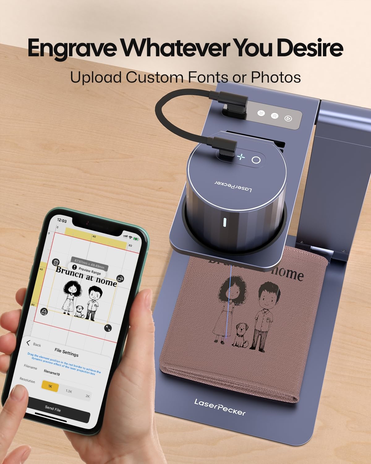 - Plug & Play: Simply launch LaserPecker APP and connect with Bluetooth, you can create engraving up to 4 ’’x 4 ’’ (100 * 100 mm) by either uploading a picture, typing text, or importing G-code file. Ideal for engrave labels and decorations on stuff such as wallets, notebooks, and phone case etc., rather than large-scale engraving projects