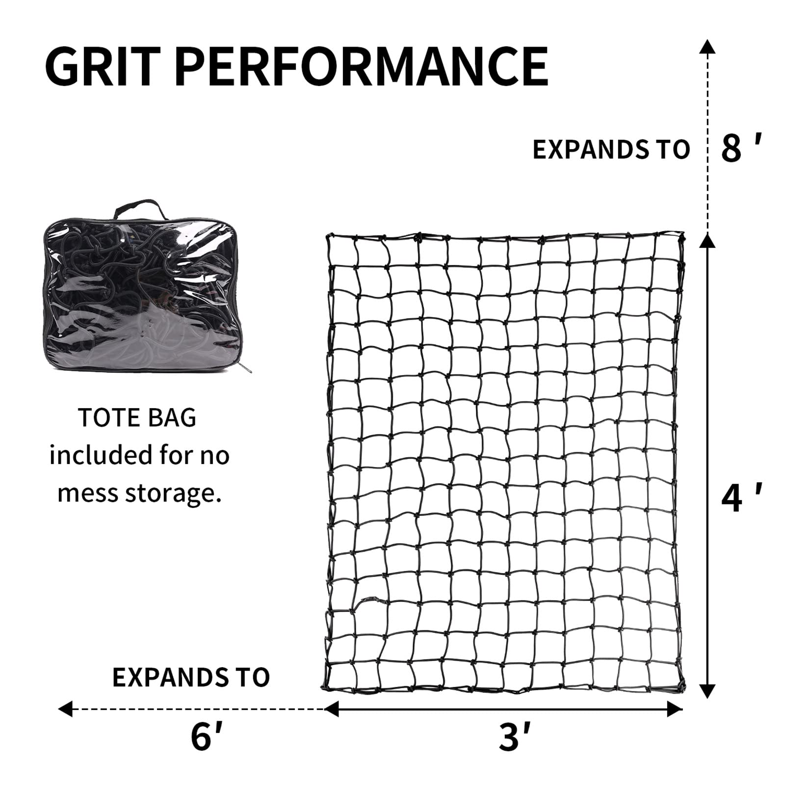 - [ Cargo Net 3'x 4' ] : Designed with tight 3” x 3” mesh squares, the bungee netting keeps small items from falling out. 12 adjustable carabiners + 12 adjustable ABS plastic hooks quickly strap down light loads by simply moving hooks from 1 mesh square to another. Perfect solution for camping, travelling.Each net comes with a convenient zipper storage bag, so users can easy to carry and store the netting in the trunk or garage.