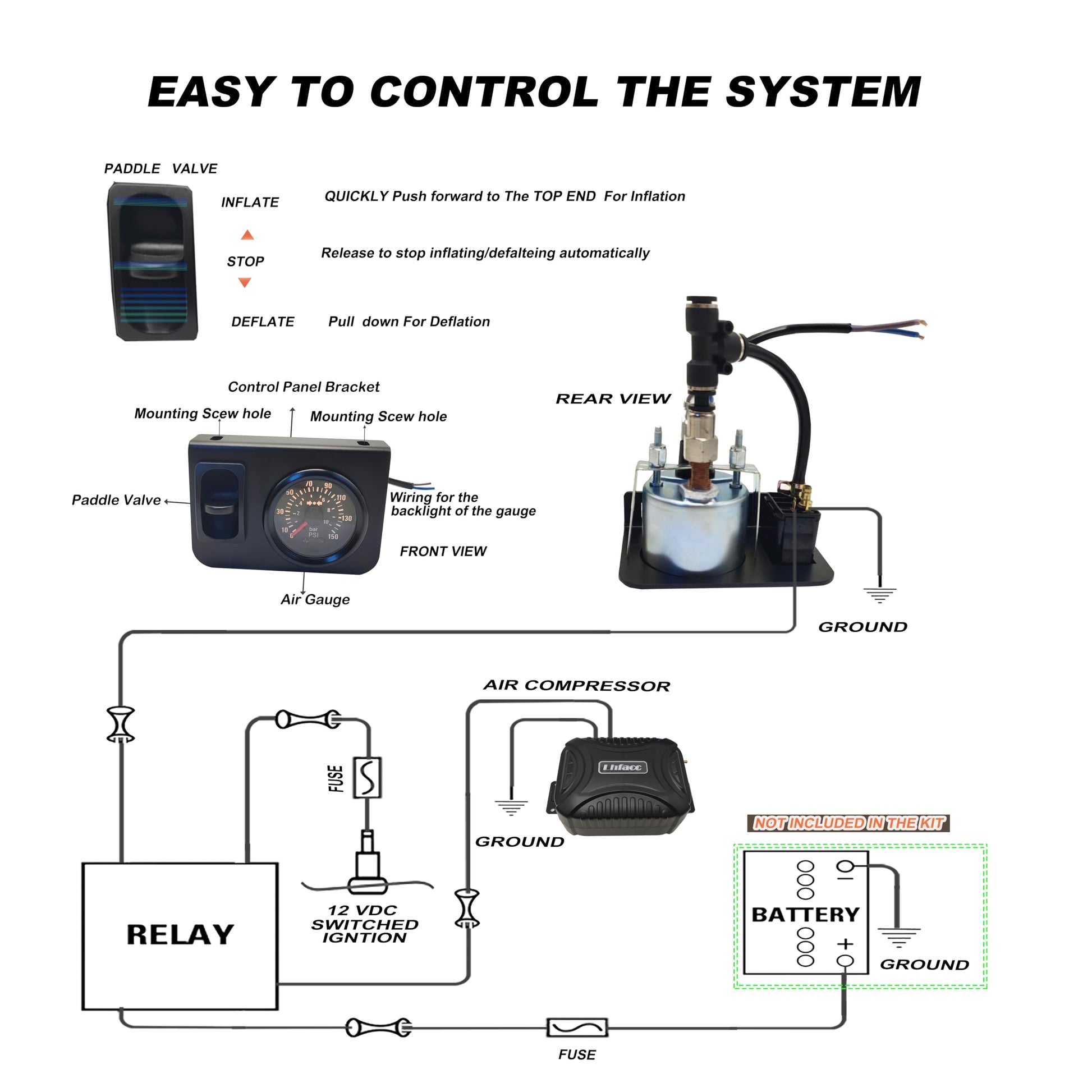 - How to Use: The paddle valve can inflate and deflate two air springs seperately and the digital air gauge displays the air pressure synchronously, the system does not need an air tank and it can drive the compressor automatically when you push up the paddle valve to inflate.
