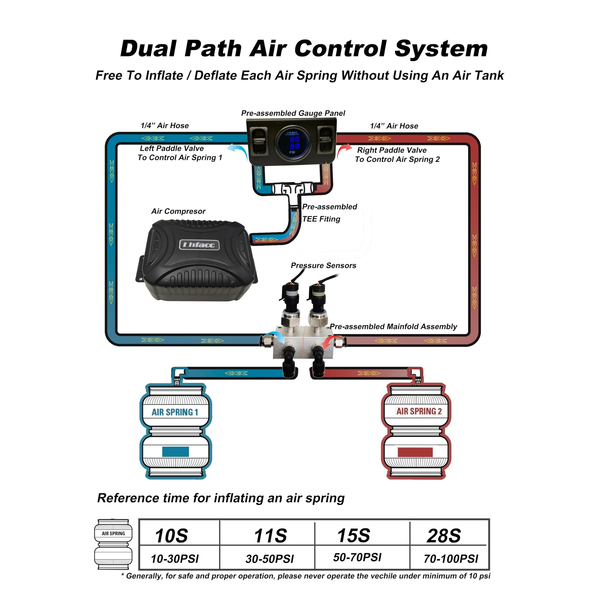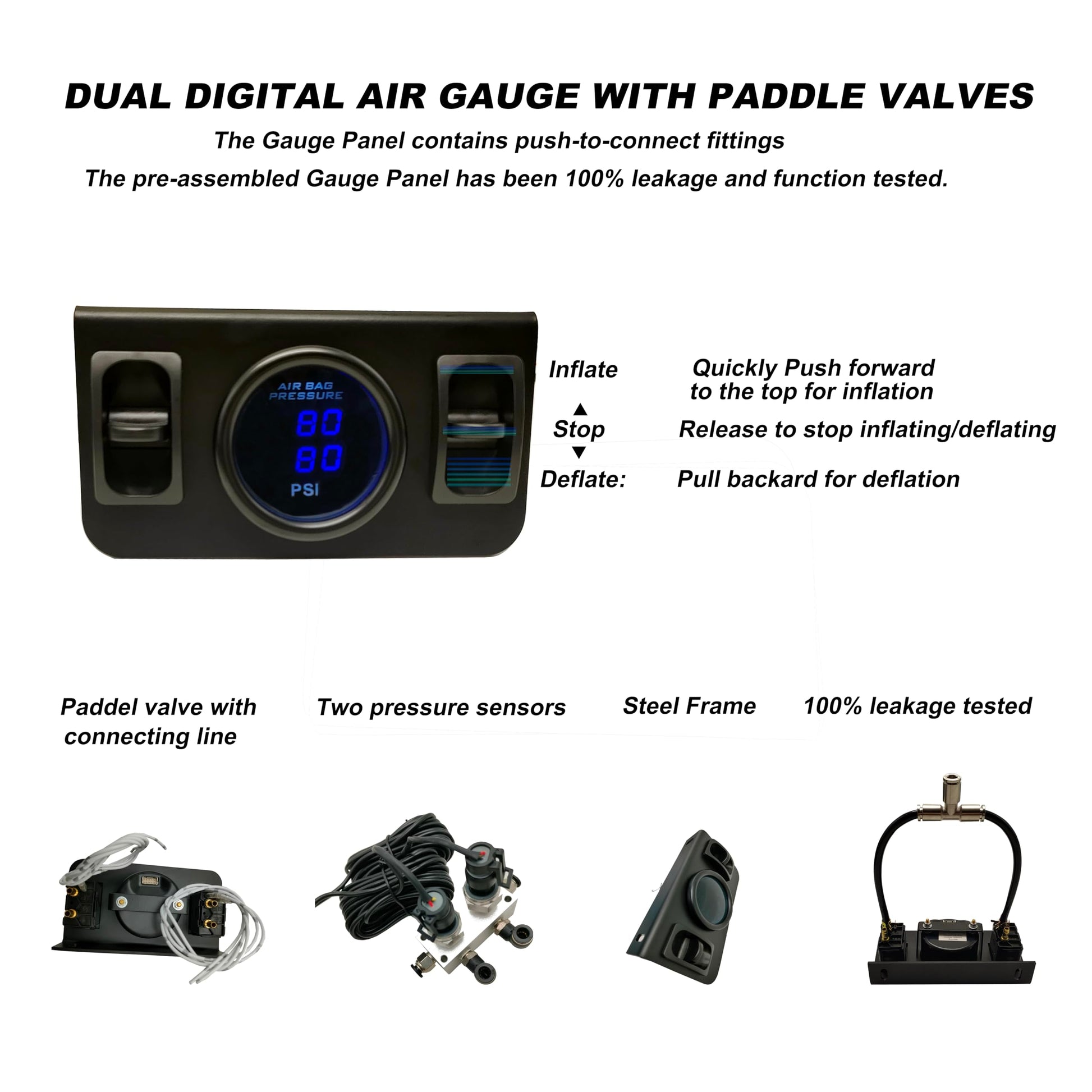 - How to Use: The paddle valve can inflate and deflate two air springs seperately and the digital air gauge displays the air pressure synchronously, the system does not need an air tank and it can drive the compressor automatically when you push up the paddle valve to inflate.