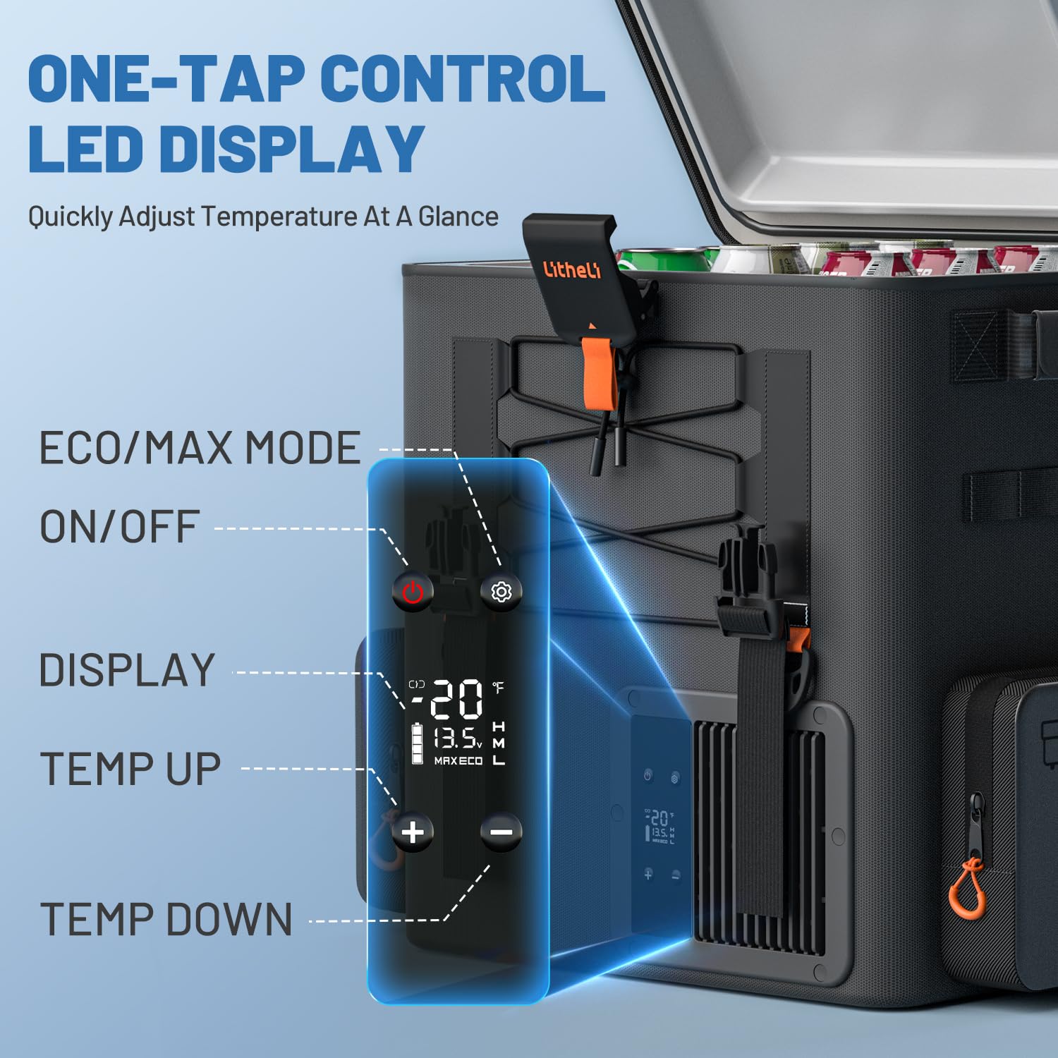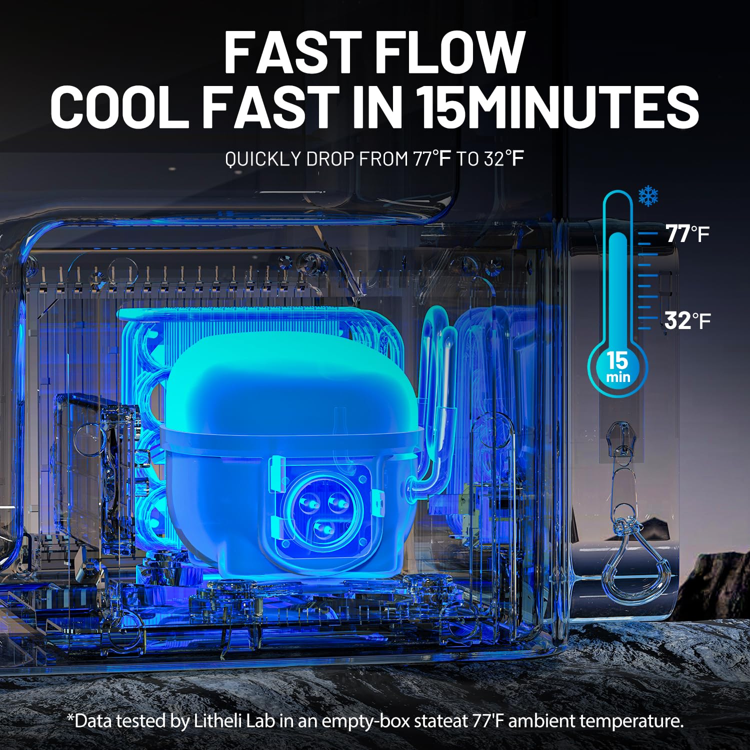 - [Turbo Cooling & Extended Freshness] Experience 15-minute rapid cooling (77℉→32℉)- 3x faster than standard electric coolers. Maintain precise temps from -4℉(freezing) to 68℉(warming) using the digital control panel. The display shows the temperature in real time.Triple-layer insulation keeps contents chilled for 4hrs during power outages. *Pro Tip: Use as a car or truck accessories fridge for road trips or standalone camping cooler for beach camping.