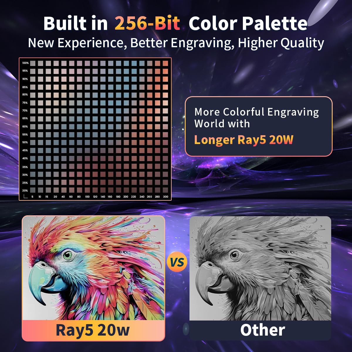 - 【More detailed and Multi-Color Engraving】 RAY5 20W laser engraver with a newly upgraded 32 bits chipsets motherboard works more smoothly and stable. The advanced built-in 256-bit color scale with 0.08 * 0.1mm ultra-fine laser focus area achieves a finer engraving result and a higher contrast effect. And an air-assisted interface is reserved, which can be easily matched with various air pumps, and more clean surfaces.Bringing you a more comfortable cutting experience.