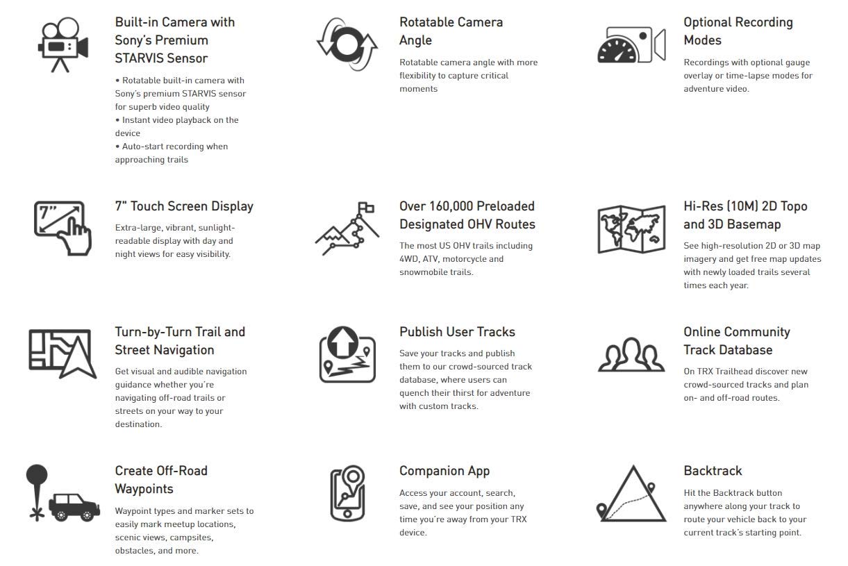 Details: The Magellan TR7 Cam Trail and Street GPS Navigator with a Camera Highlight is upgraded with a rotatable built-in camera with Sony’s Premium STARVIS Sensor, so your journey can be recorded with superb video quality. The TR7 Cam will auto-start recording when approaching trails. The gauge overlay or time-lapse modes are optional for adventure video. Instant video playback on the device is always a good idea to watch again your extraordinary performance. Like the TRX7, The TR7 Cam is equipped with a 7' hi-definition touchscreen and our award-winning off-road navigation software, which gives you turn-by-turn directions on OHV trails and streets. The TR7 Cam comes preloaded with over 160,000 designated OHV routes from forest and public lands and includes Magellan’s award-winning street navigation to get you straight from your starting point to the trail. Search trails using your TR7 Cam or search for trails in a constantly growing crowdsourced track database on www.TRXTrailhead.com. Magellan's trail database contains over 160,000 preloaded OHV routes and user-generated tracks created by fellow off-roaders. The community database is accessible by desktop, tablet, or mobile device, and crowd-sourced tracks contain personal observations so that you can search for them by location, track difficulty, rankings, and more.