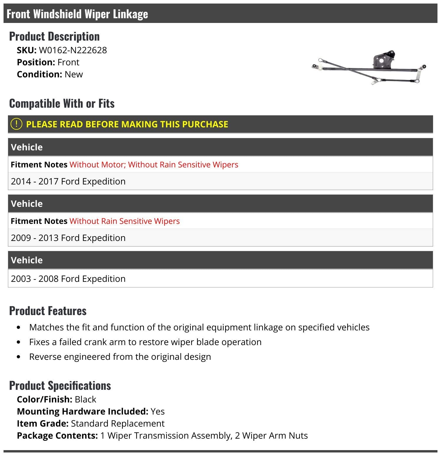 Details: Front Windshield Wiper Linkage - Compatible with 2003 - 2017 Ford Expedition (without Rain Sensitive Wipers)