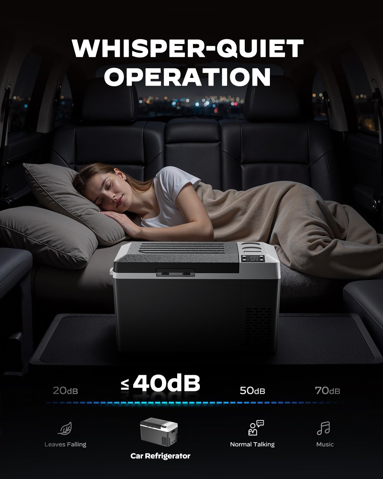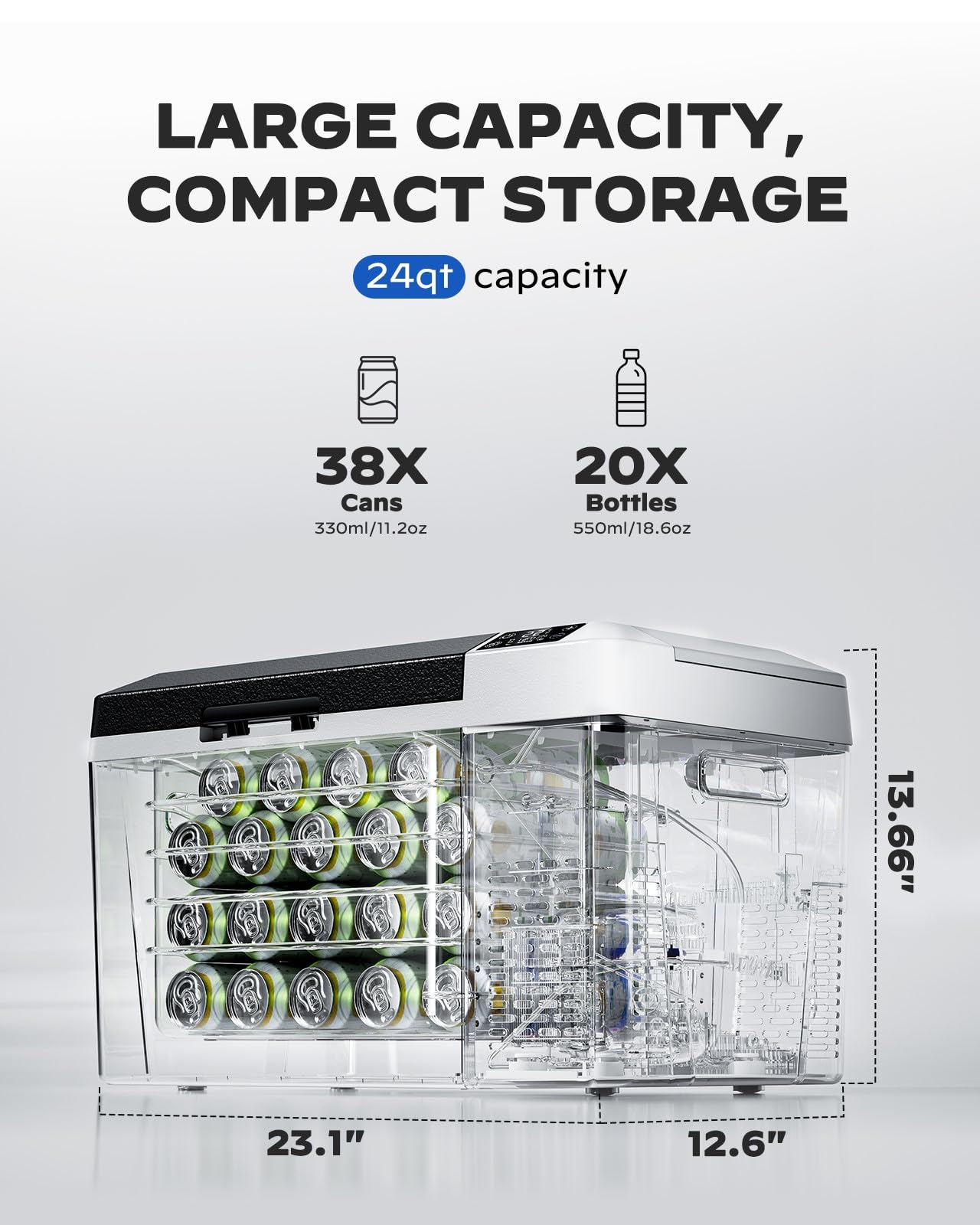 - Large Capacity Compact Storage:With 24QT capacity, this car refrigerator can hold approximately 38 cans of 330ml drinks or essential snacks. This electric cooler's compact size makes it an excellent choice for short trips, weekend camping, or everyday use, offering enough space for all the essentials without taking up too much room.