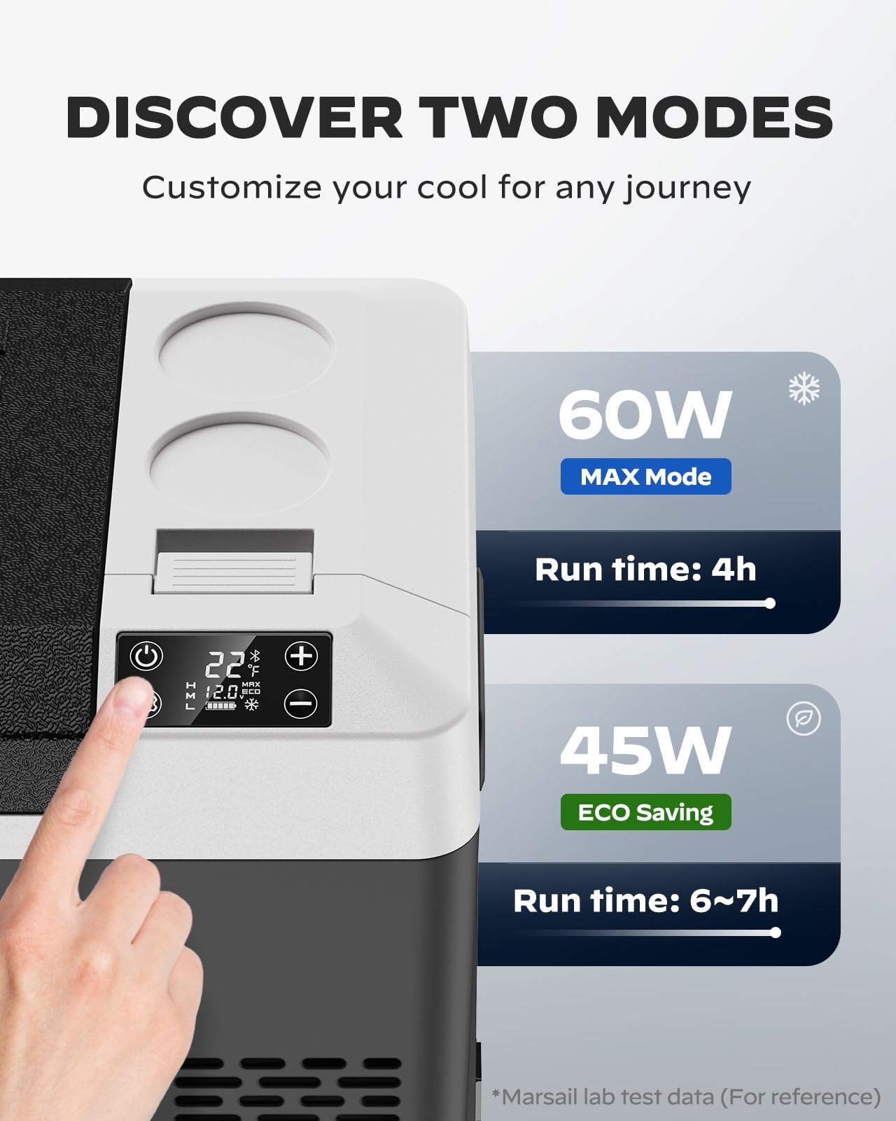- Dual Cooling Modes:Choose between MAX mode for fast and powerful cooling or ECO mode for energy-saving operation. The ECO mode of this 12v fridge helps conserve battery life, making this car fridge ideal for long trips while reducing environmental impact – a sustainable solution for cooling your food and beverages.