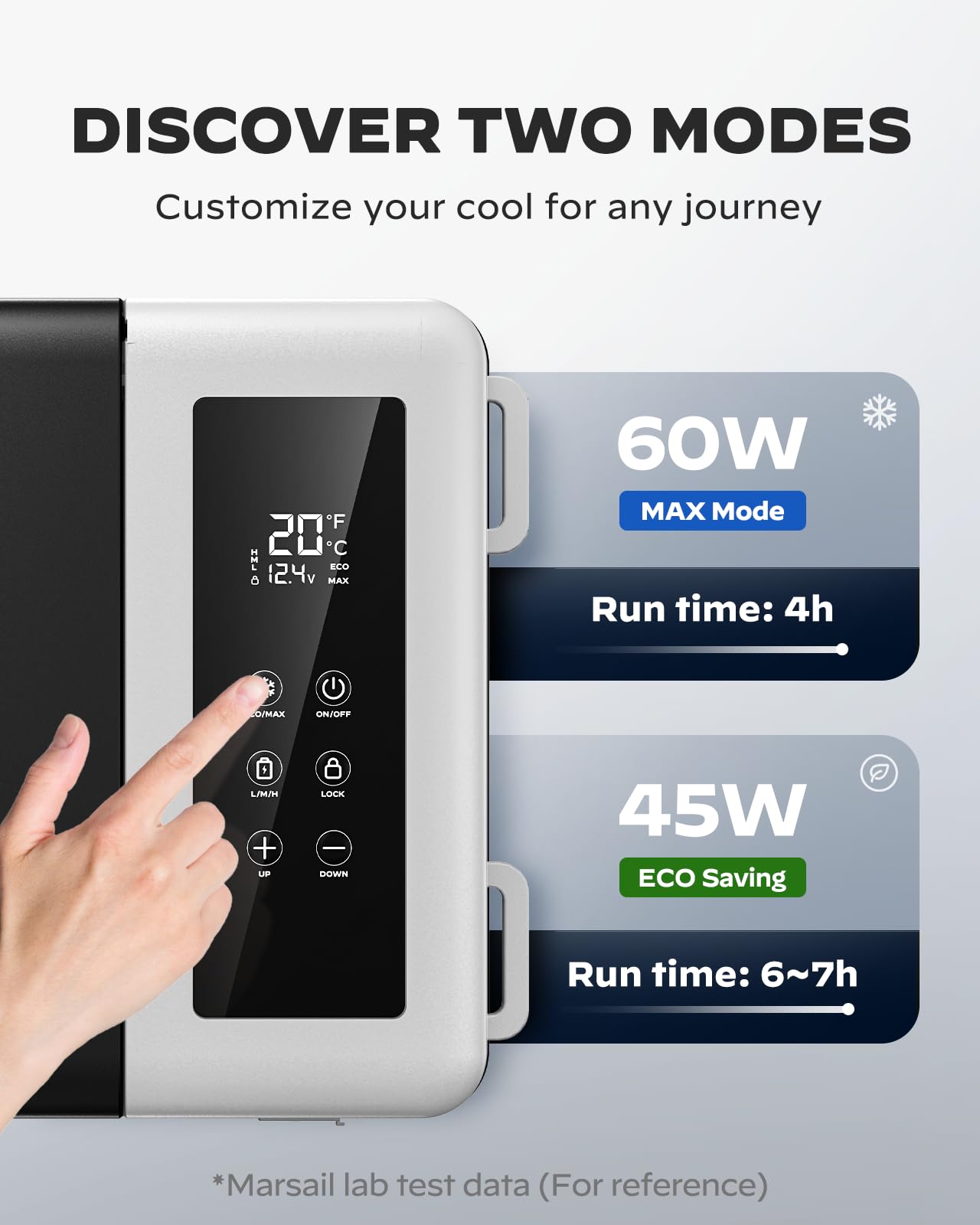 - Efficient Cooling with Compressor Technology:This car refrigerator uses advanced compressor technology to achieve fast cooling, keeping your food fresh or frozen without delay. With two cooling modes—MAX Mode (60W) for rapid cooling, it takes only 15 minutes to bring the temperature from 78°F to 32°F, and MIN Mode (45W) for long-lasting cooling with less power. Ideal for road trips, camping, and outdoor activities, this electric cooler is perfect for all your on-the-go cooling needs.
