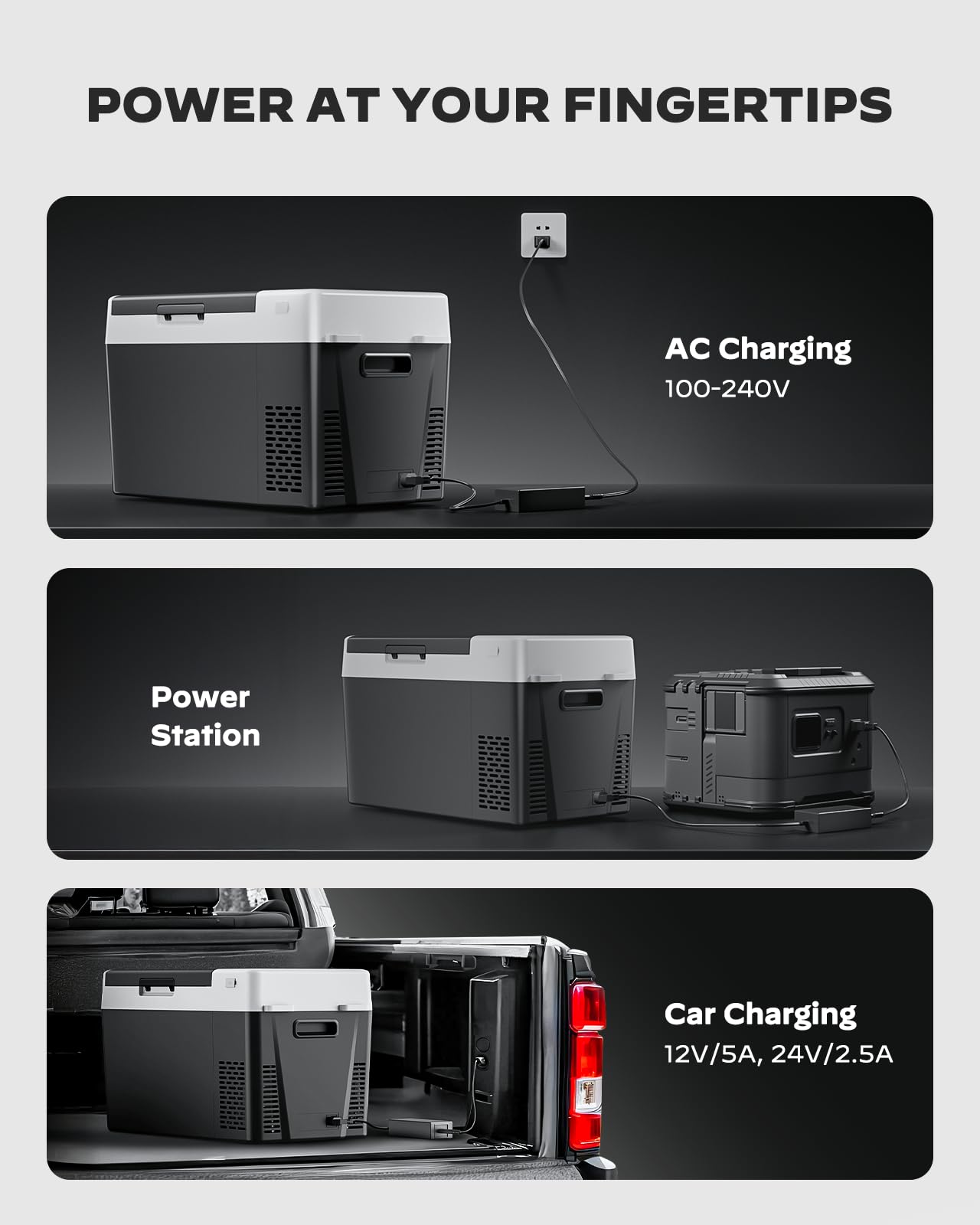 - Two Power Options - Car & Home:Featuring two power options, this electric cooler is equipped with both 110/240V AC and 12/24V DC adapters, allowing you to power it at home or in your car. Whether you're on a road trip or relaxing at home, these versatile power options ensure your food stays cool wherever you are with the car fridge.