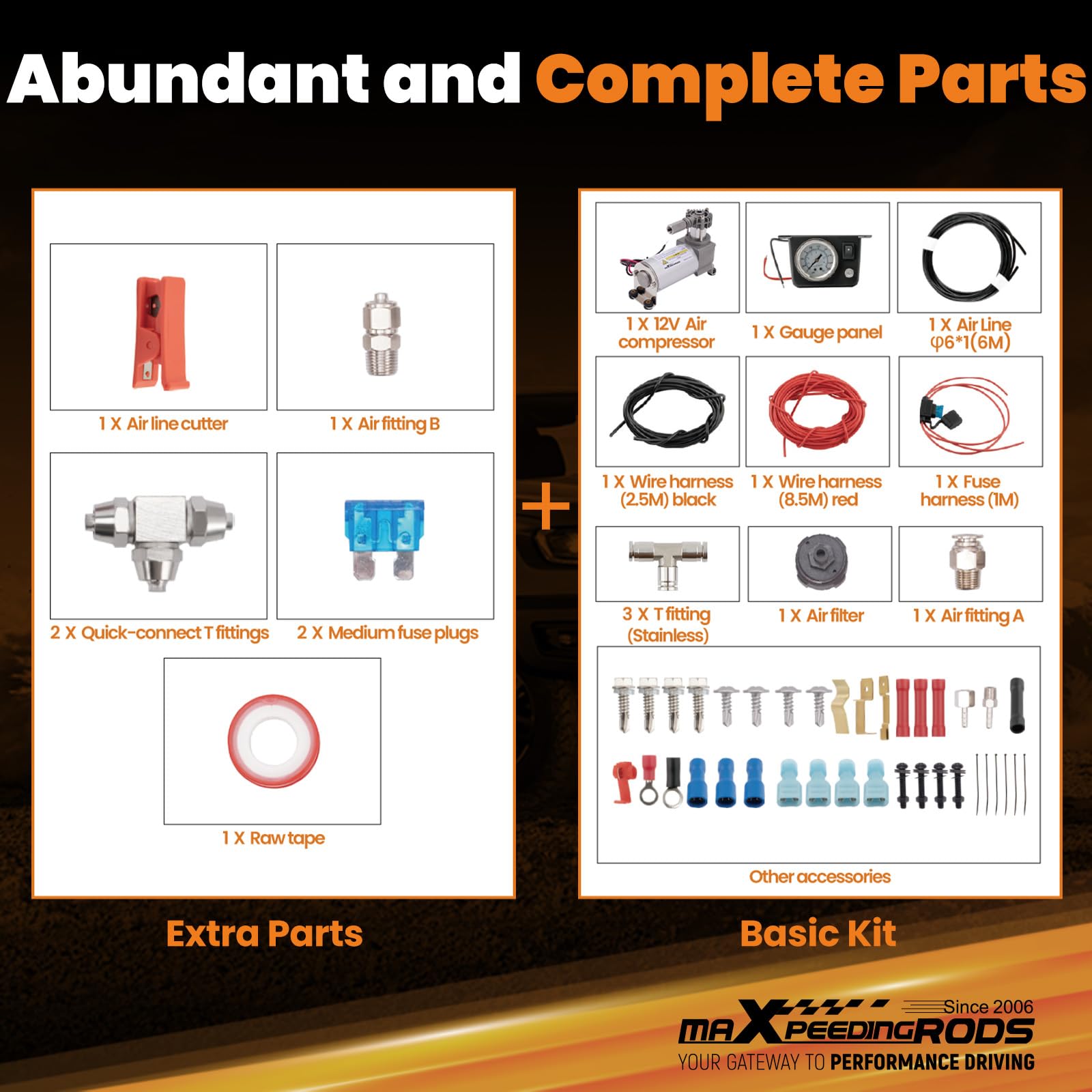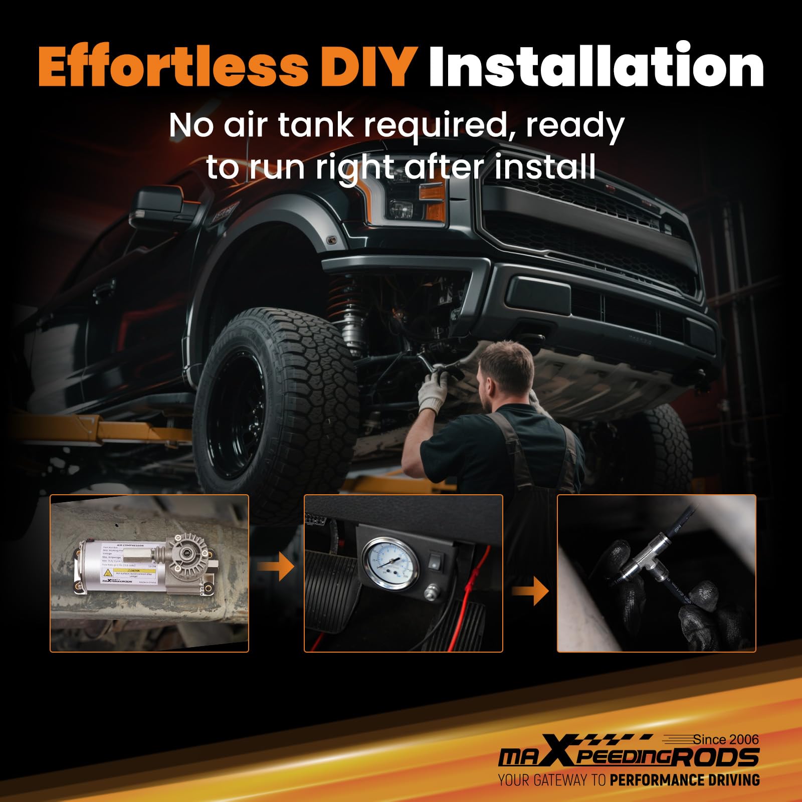 - Effortless Installation: The compressor kit comes with a 12V compressor, an analog gauge, 19.68' air line, installation manual and complete mounting hardware, meaning that you can effortlessly install the kit in hours by yourself