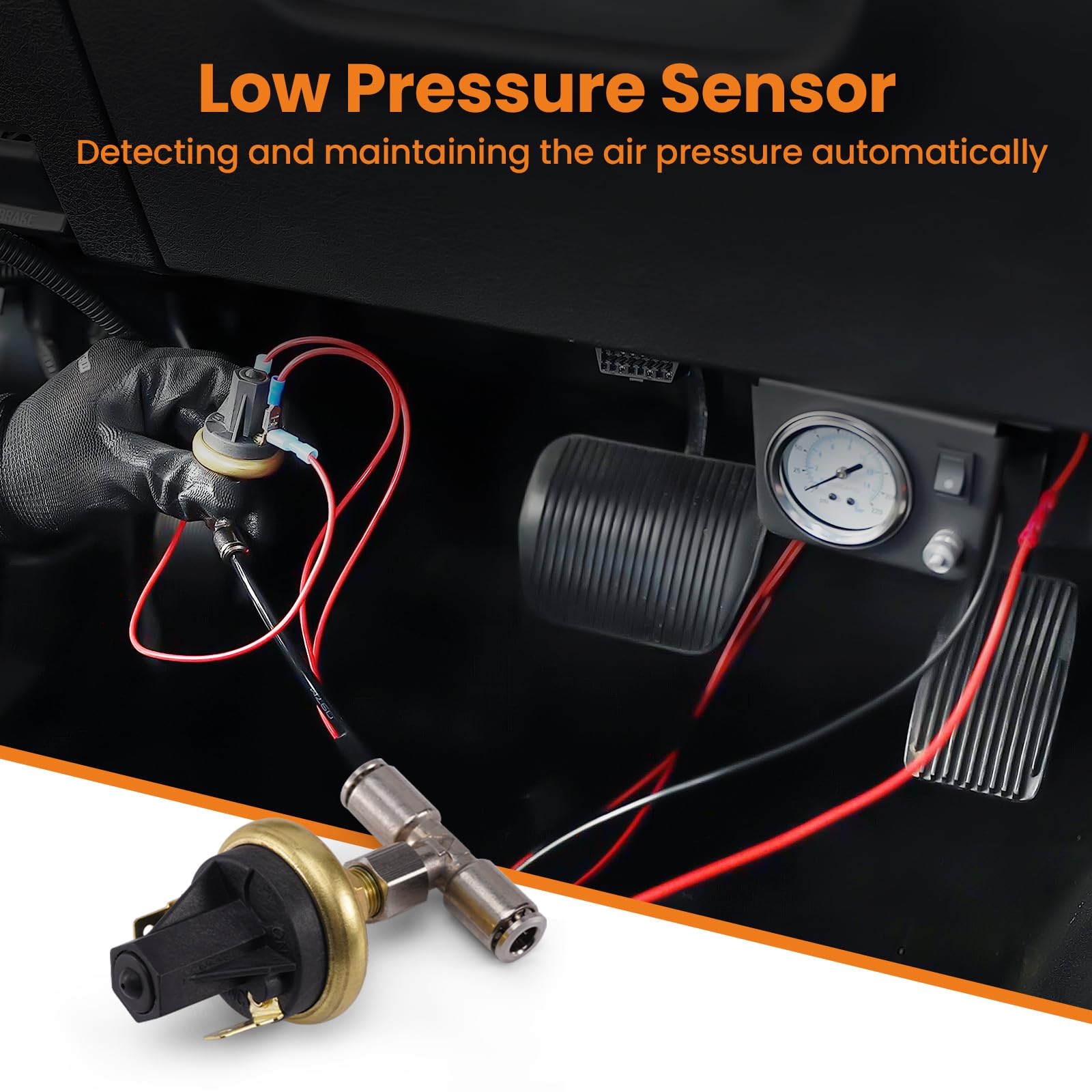 - 【Automatic Adjustment】This upgraded air compressor system features a low pressure sensor, which detects when the air pressure in your springs falls below a minimum level and restore the pressure automatically, ensuring long spring life and maintaining a safe operation pressure level.