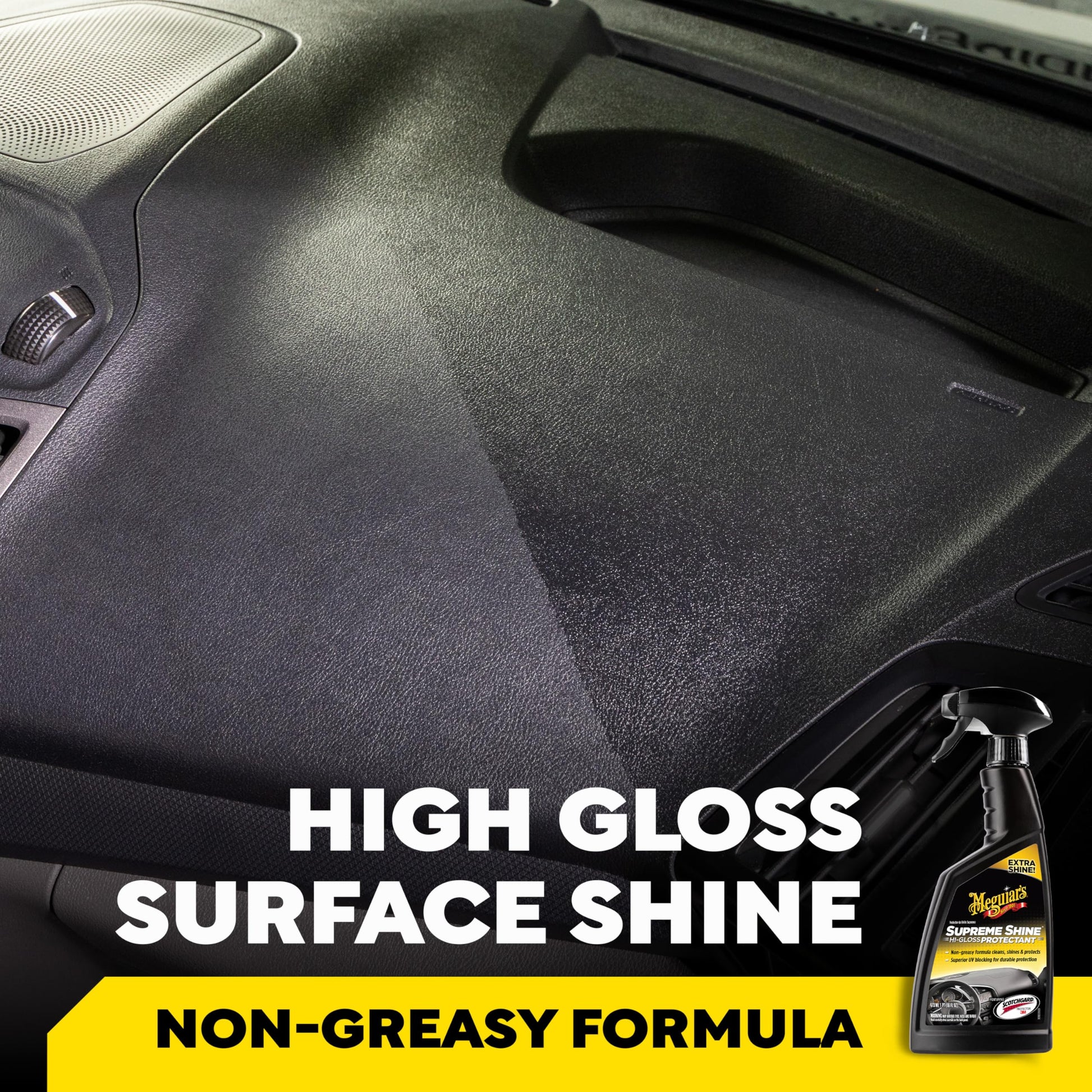 Details: Meguiar's Supreme Shine Hi-Gloss Protectant offer a superior high shine gloss with superior UV blocking protection to preserve vinyl, rubber and plastic surfaces. This non-greasy formula quickly cleans, shine and protects defending against fading, cracking and aging in one easy step.