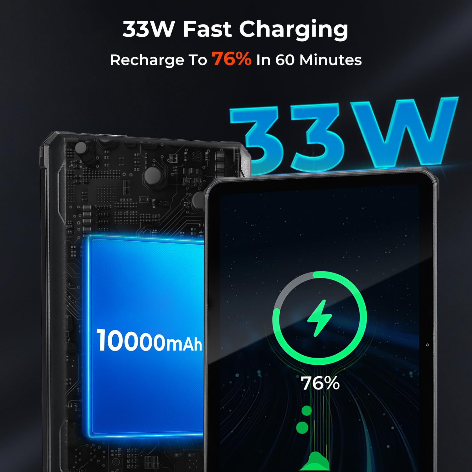 - [No More Battery Anxiety] The MUNBYN heavy duty tablet ILT02 is equipped with powerful 33W fast charging and a high-capacity 10,000mAh battery, reaching 76% charge in 60 minutes, while a standard 20W charger takes 80 minutes to achieve the same level. Even in remote areas without charging facilities or during extended outdoor activities, you won't have to worry about battery life, enjoying uninterrupted high-efficiency performance.
