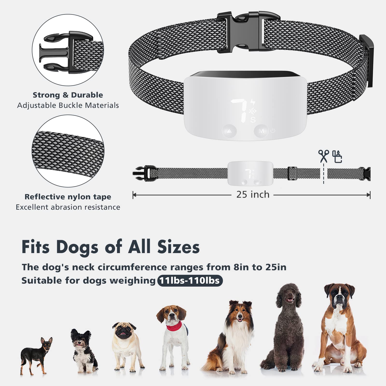- Comfortable for all sizes of Dogs:The bark collar is light, the collar strap is sturdy and adjustable for the length of the dog's neck( fits for neck sizes 7.8' - 25' dogs around 8 to 120 lbs), this dog bark collar is suitable for small, medium and large dogs. IP67 waterproof ensure it can be able to work normally in rainy or humid environments without damage