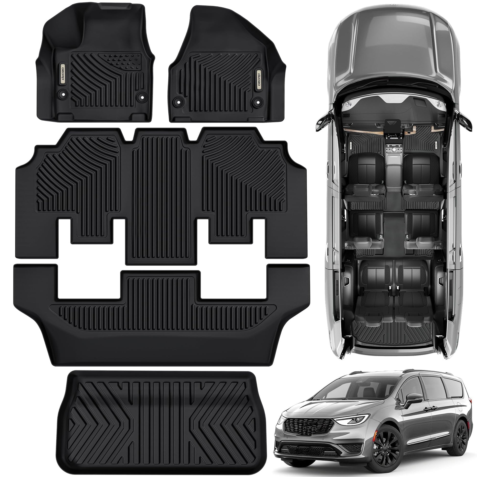 OEDRO Floor Mats & Cargo Mat Fit for Chrysler Pacifica 2017-2025 (No Hybrid Models), Fit 7 and 8 Passenger Model, Fit 2020-2025 Voyager Custom All-Weather Protection Full Set TPE Floor Liners