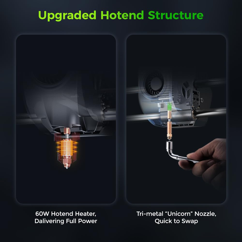 - NEW TOP-NOTCH DIRECT DRIVE EXTRUDER: The direct drive extruder of Ender 3 V3 Plus is enhanced by a bolster spring and a ball plunger. It grips on filament tightly without slackening off. It fulfilled the 1000h+ clog-free extrusion. 60 watt hotend ceramic heater surrounds the hotend. It can heat from 0 to 300 degree within 75 seconds. It can fully melt PLA, TPU, PETG, ABS, PLA-CF, PETG-CF, CR-carbon and other high-temp filaments on the fly. The durable steel-tipped copper nozzle is integrated with a titanium alloy heatbreak