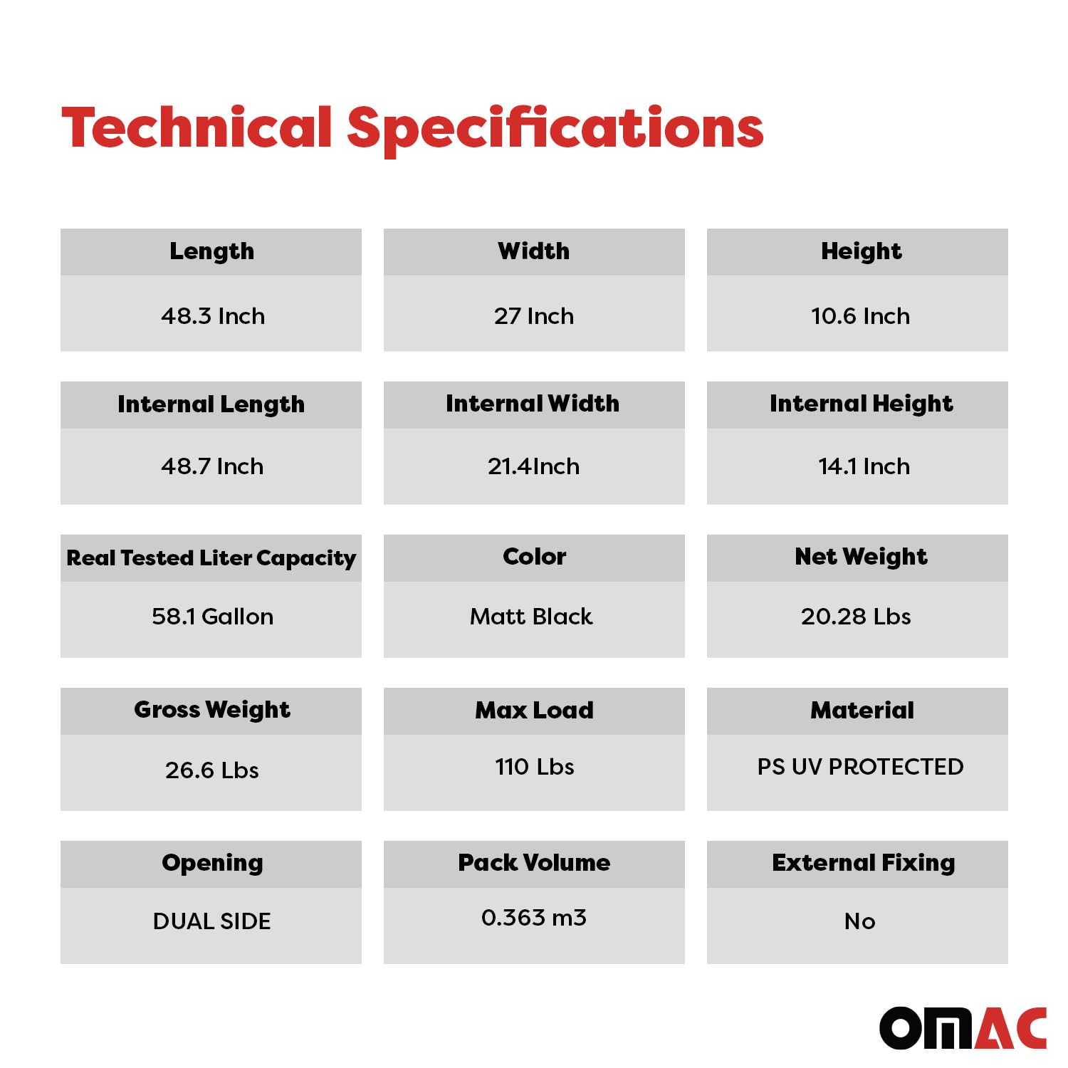 - Cargo Box: Length: 48.3 Inch, Width: 26.1 Inch, Height:10.6 Inch, Weigth: 20.2 Lbs, Max Load: 110 Lbs. This premium cargo box is perfect for all your travel needs. Featuring a sleek matt black finish, it is designed to be Waterproof and UV Protected, ensuring your belongings stay safe in all weather conditions. Compatible with all vehicles. '2 Straps + 2 Locks + 4 U bolts + 4 T-bolts are included, the bolts material are STEEL. T bolt dimensions: Length 25 mm; Width 19 mm; Height 5.5 mm.'