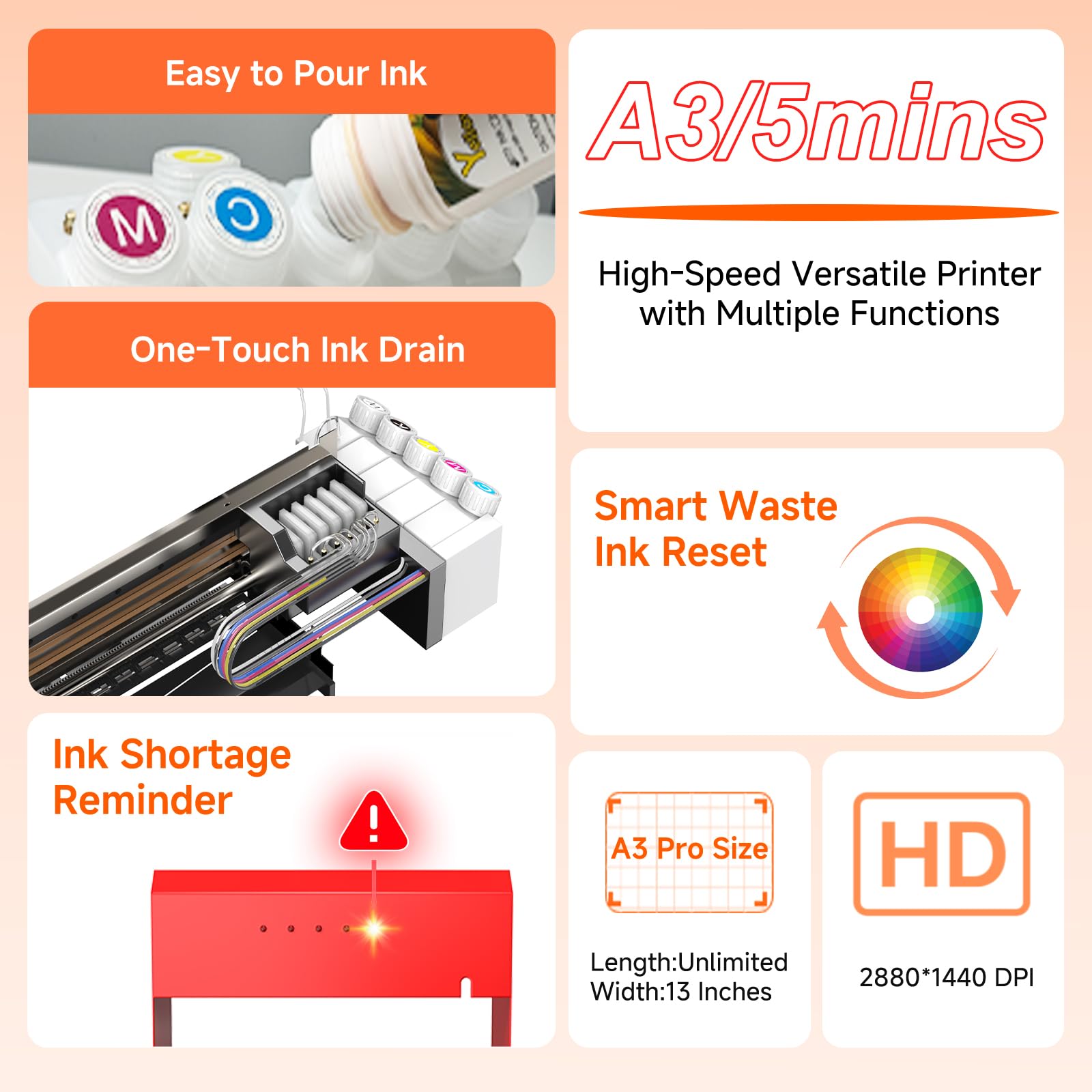 - 【Upgraded A3 DTF Printer】The upgraded A3 DTF roll printer is equipped with automatic Cleaning System, white ink stirring system and White Ink circulation System,which will avoid the printhead clog, and also make the printed white ink more uniform.