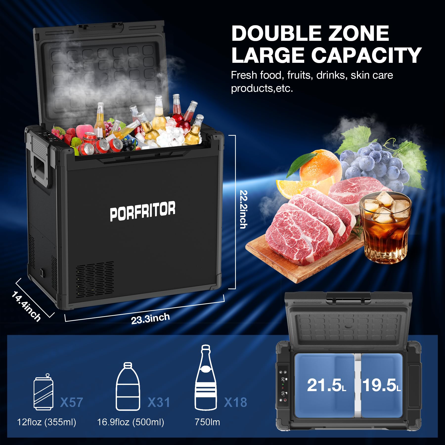 - 【Dual Zone Large Capacity】12V dual zone car refrigerator is divided into refrigeration zone and freezer zone, dual temperature single control function, the middle partition can be removed to use as a single zone single temperature refrigerator, the temperature range is -4°F to 68°F. 45L/48 quart portable freezer is suitable for camping, travel, truck, home can store seafood, snacks, meat and drinks.