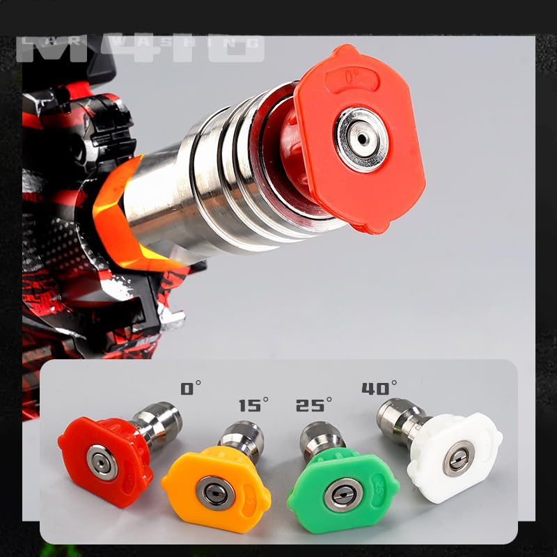 - ✅ Includes 4 quick-connect spray nozzles (0°, 15°, 25°, 40°) – easily switch between spray patterns for everything from tough grime to delicate rinsing.