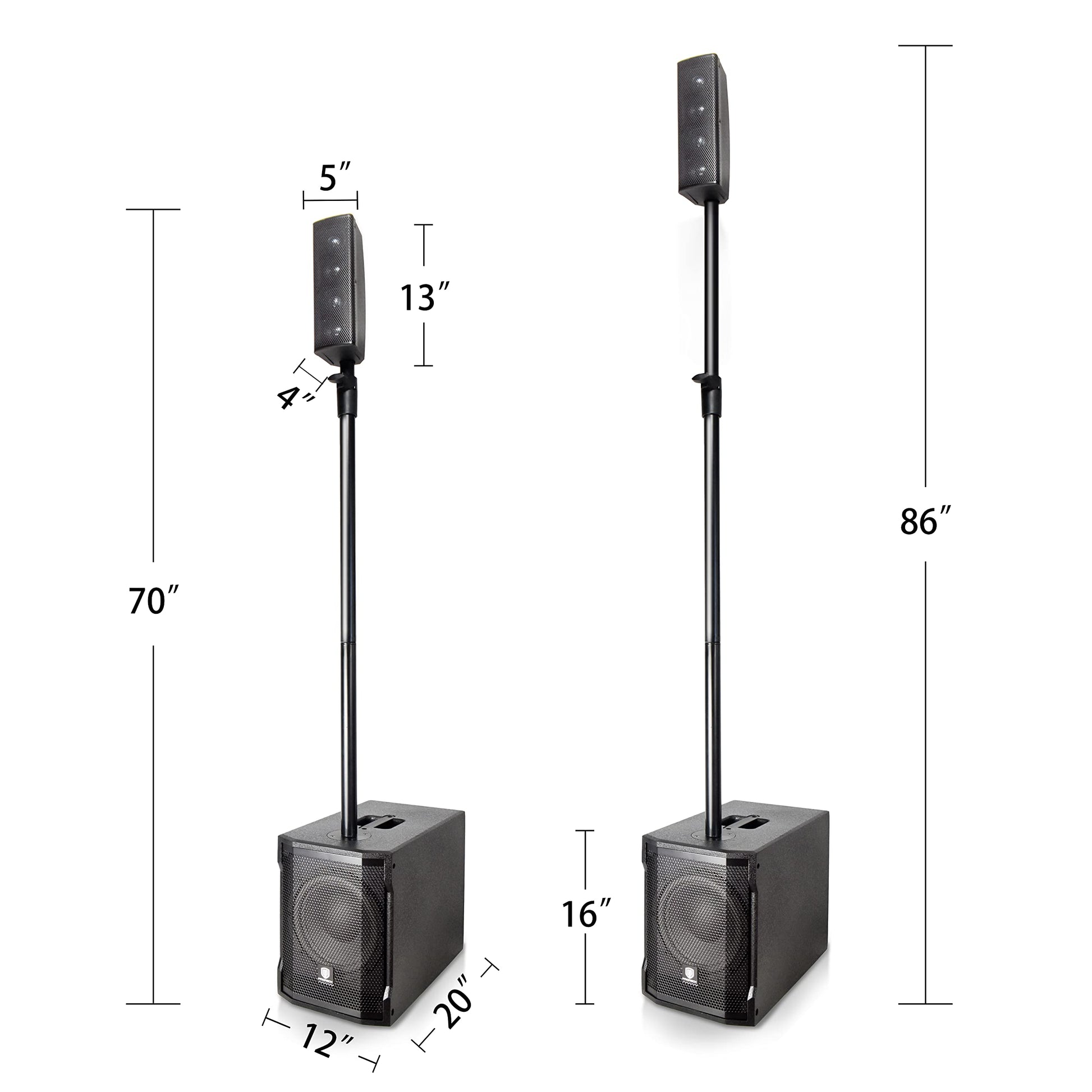 - Height Adjustable and Setup Simplified: The PA Speaker System’s height can be adjustable from 59inch to 85inch. Just combine the three main parts and you're ready to enjoy the music. There are handles on the top and side of the active subwoofer, you can use to lift and transport the subwoofer conveniently. Item weight: 20.7KGS/45.5LBS. Item size: 28*16.1*19.5 inch.