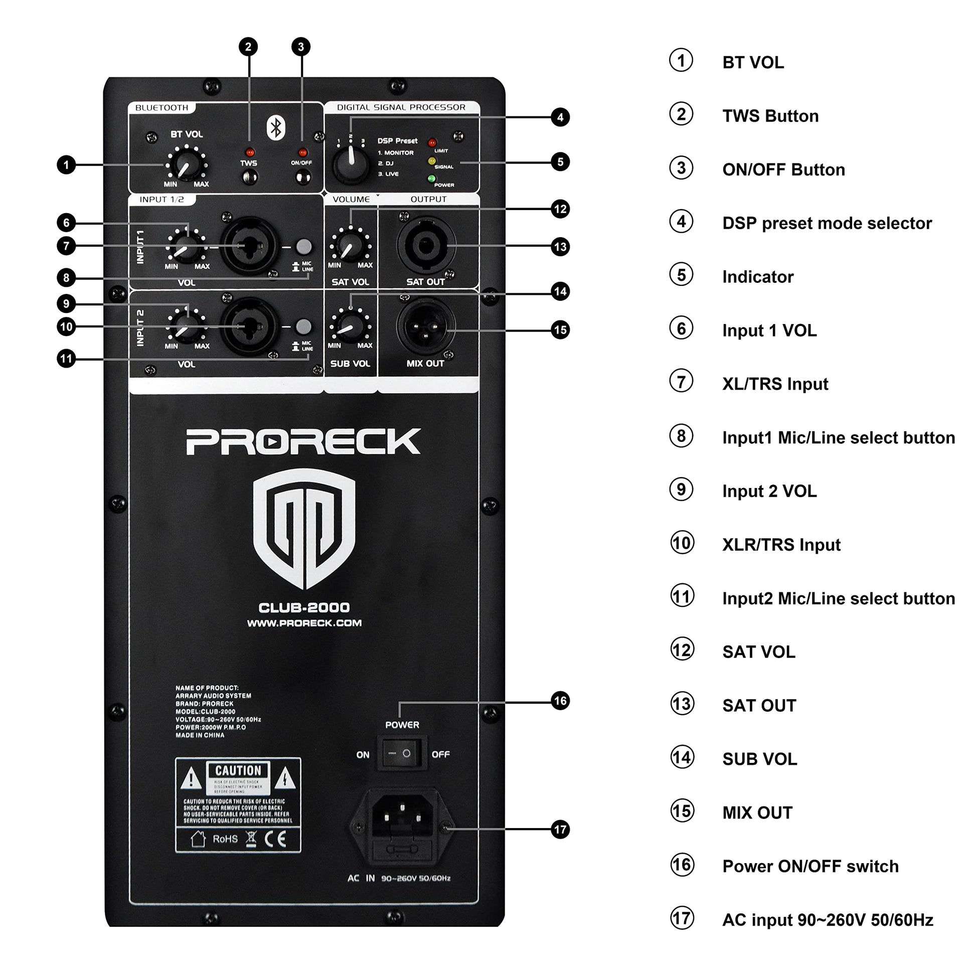- PRORECK CLUB 2000 Powered PA Speaker System: Consists of (1)active bass subwoofer(L 20inch W 12inch H 16inch), (1) full range column speaker(L 4.5inch W 5inch H 13inch), (1) speaker stand, (1) 5-feet Power Cable, (1)6-feet speaker cable and (1) user manual. The active subwoofer features with a CLASS-D amplifier for clear sound.