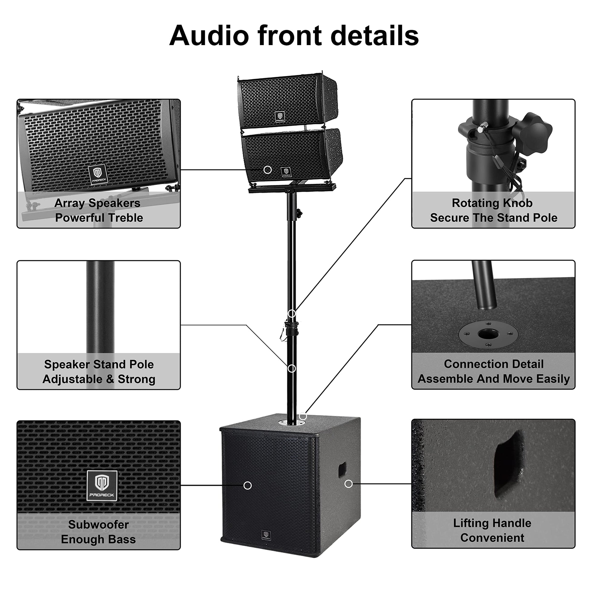 - Proreck CLUB 6000 PA Speaker System Combo Set: Consists of (1) active subwoofer,(1) passive subwoofer, (4) 6-inch line array speakers, (1) 6-feet Power Cable, (1) remote control and (1) user manual. The active subwoofer features a class D amplifier and streams clear music to the line array speakers, so it can make every audiences enjoy the music.