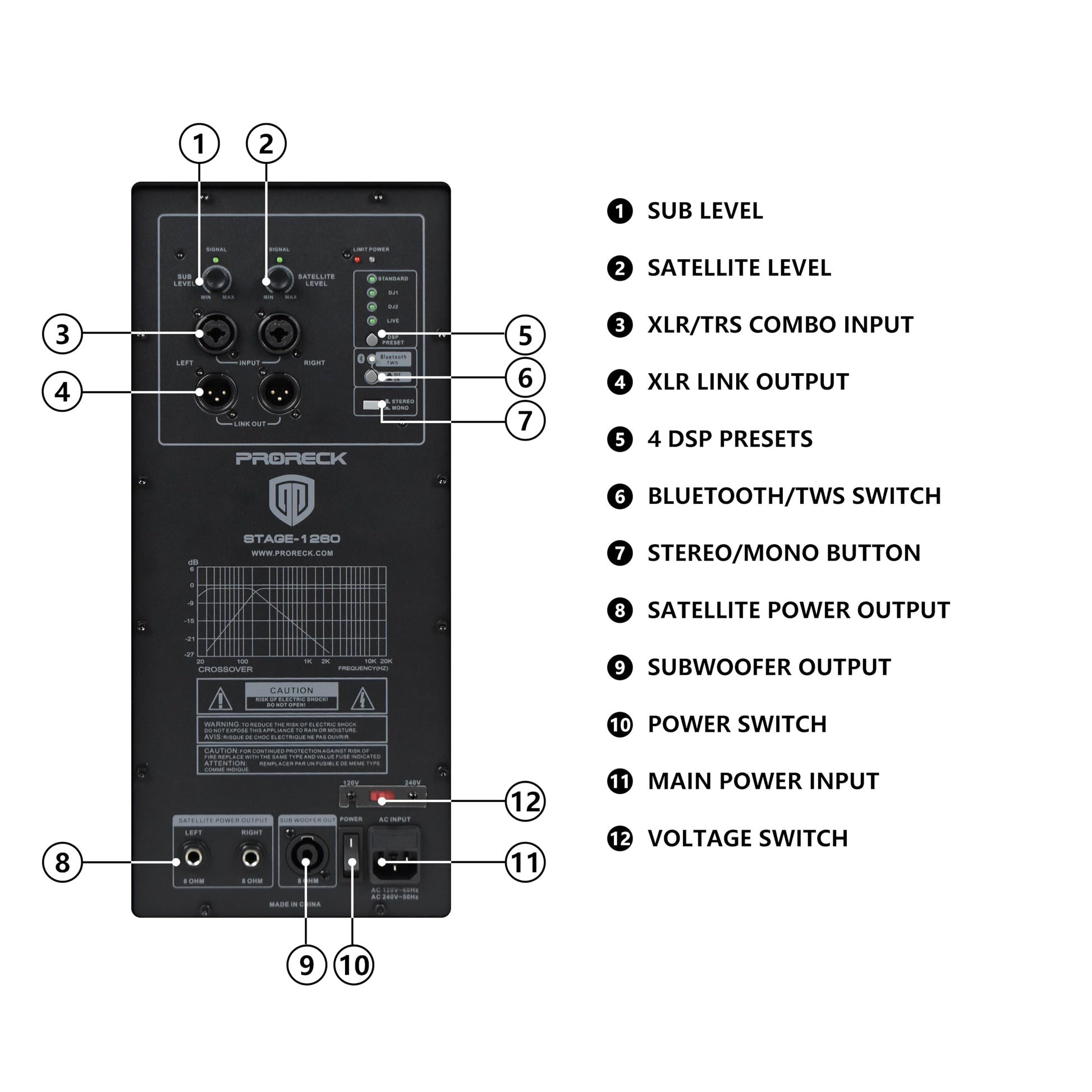 - 4 DSP PRESETS:The proreck stage 1260 features 4 DSP presets, providing exceptional sound quality and flexible audio adjustments. Each preset is meticulously designed to suit different usage scenarios. Users can easily switch between presets, ensuring the best sound performance in any environment.