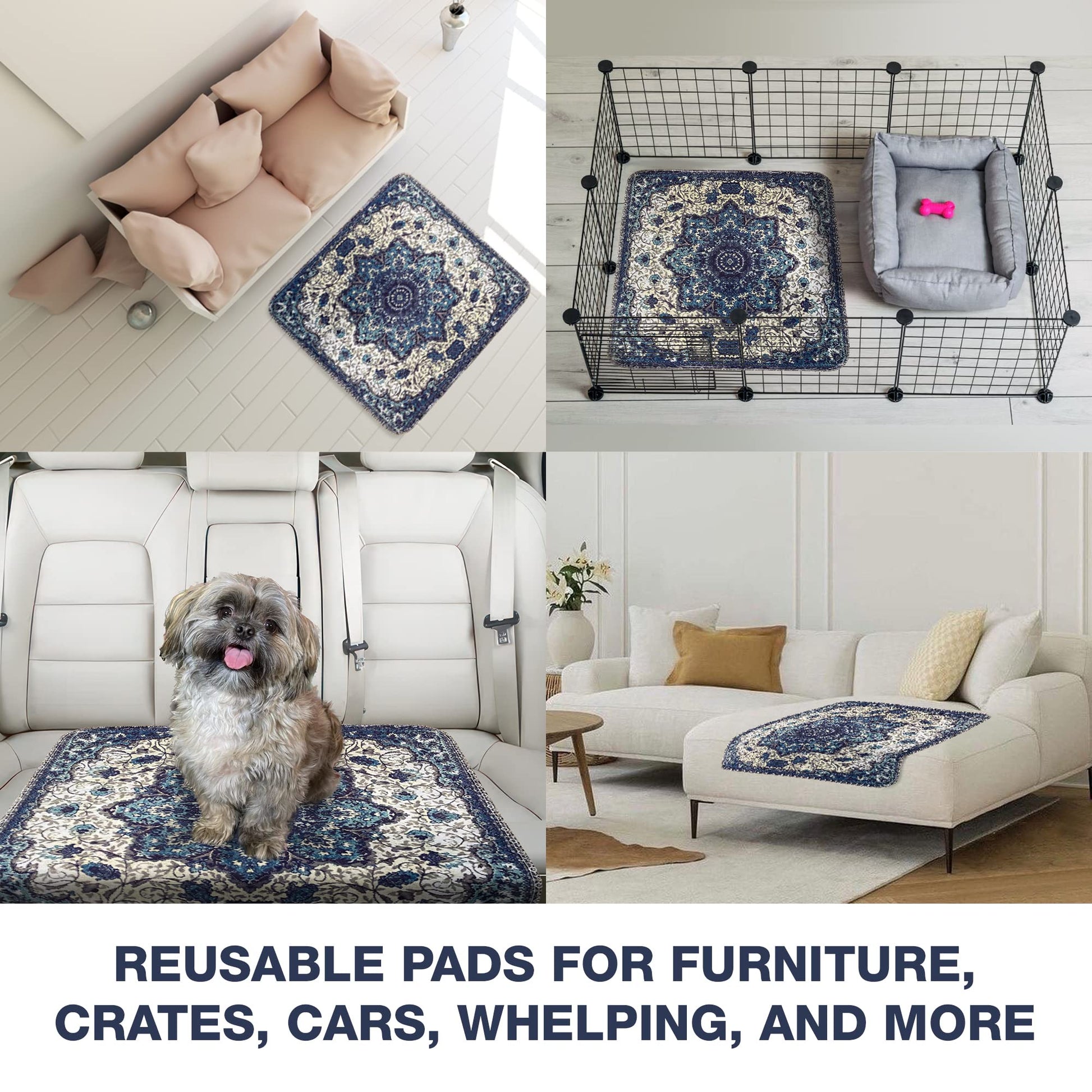 - Versatile Pet Mat for Crates, Playpens, and Floors - These multi-functional washable dog pee pads double as a comfortable mat for crates, playpens, or floor use. The soft, quilted surface provides a cozy resting spot for your pet, while the waterproof and leak-proof design protects your floors and furniture from accidents, spills, and pet hair. Perfect for travel, outdoor use, or as a designated pet area in your home, these versatile mats are a must-have for every pet owner.