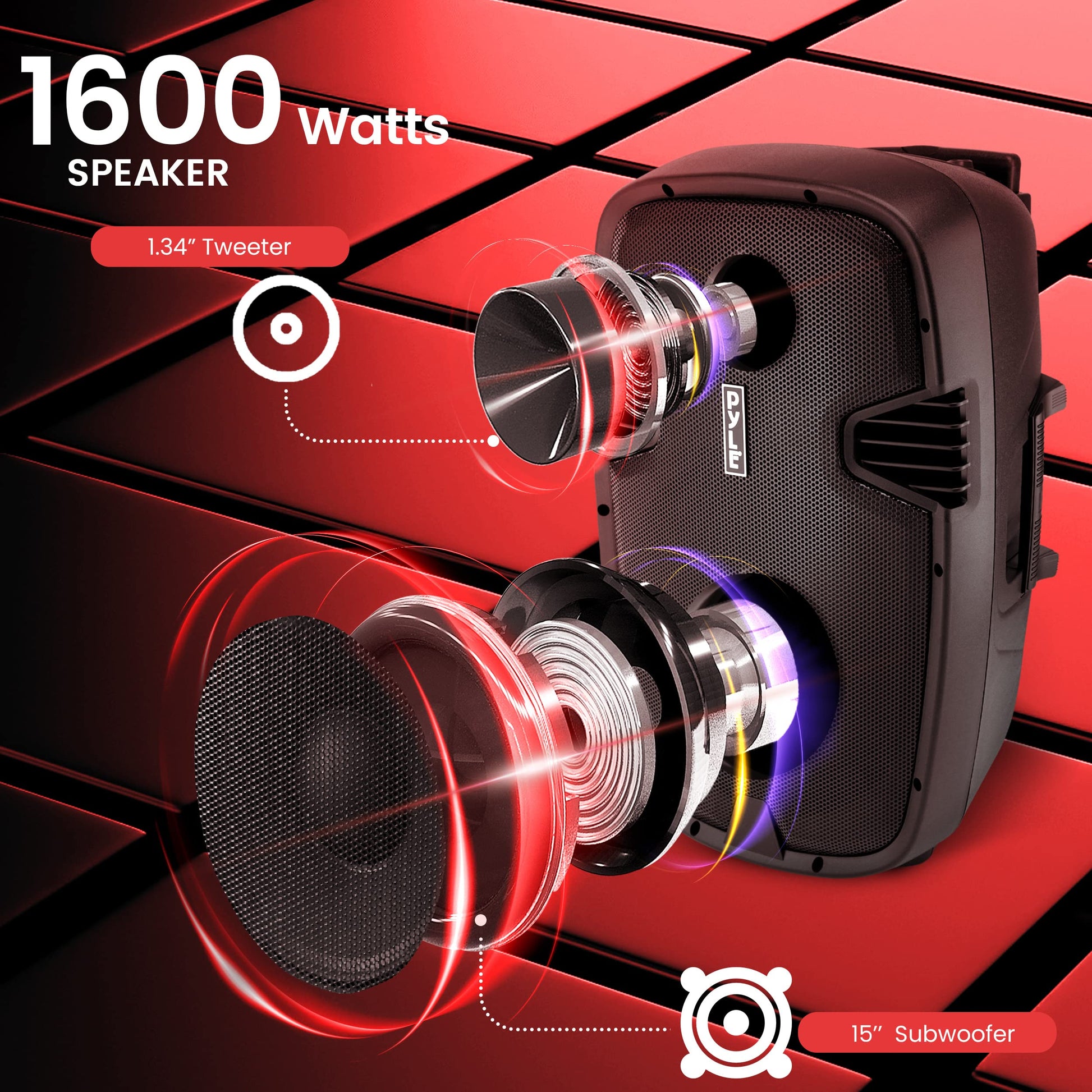 The Pyle Portable Bluetooth PA Speaker System, Built-in Rechargeable Battery, Includes (2) UHF Microphones, MP3/USB/SD Readers, FM Radio, 15’’ Speaker, 1600 Watt - Versatile PA Loud Speaker Sound System - Bluetooth Wireless Music Streaming Ability - Active 2-Way Full Range Stereo Sound - Heavy Duty, Rugged & Reliable - Built-in Rechargeable Battery - Fixed Frequency Audio Transmission - Digital LCD Display - ID3 Tag Song Readout Info - USB Flash & SD Memory Card Readers - FM Radio with Automatic Station Recognition - Includes (2) UHF Wireless Microphones - (2) 1/4'' Microphone / Guitar Inputs - Independent Adjustable Mic/Guitar Volume Controls - RCA (L/R) Line Input Connector Jacks - Ability to Connect External Devices.