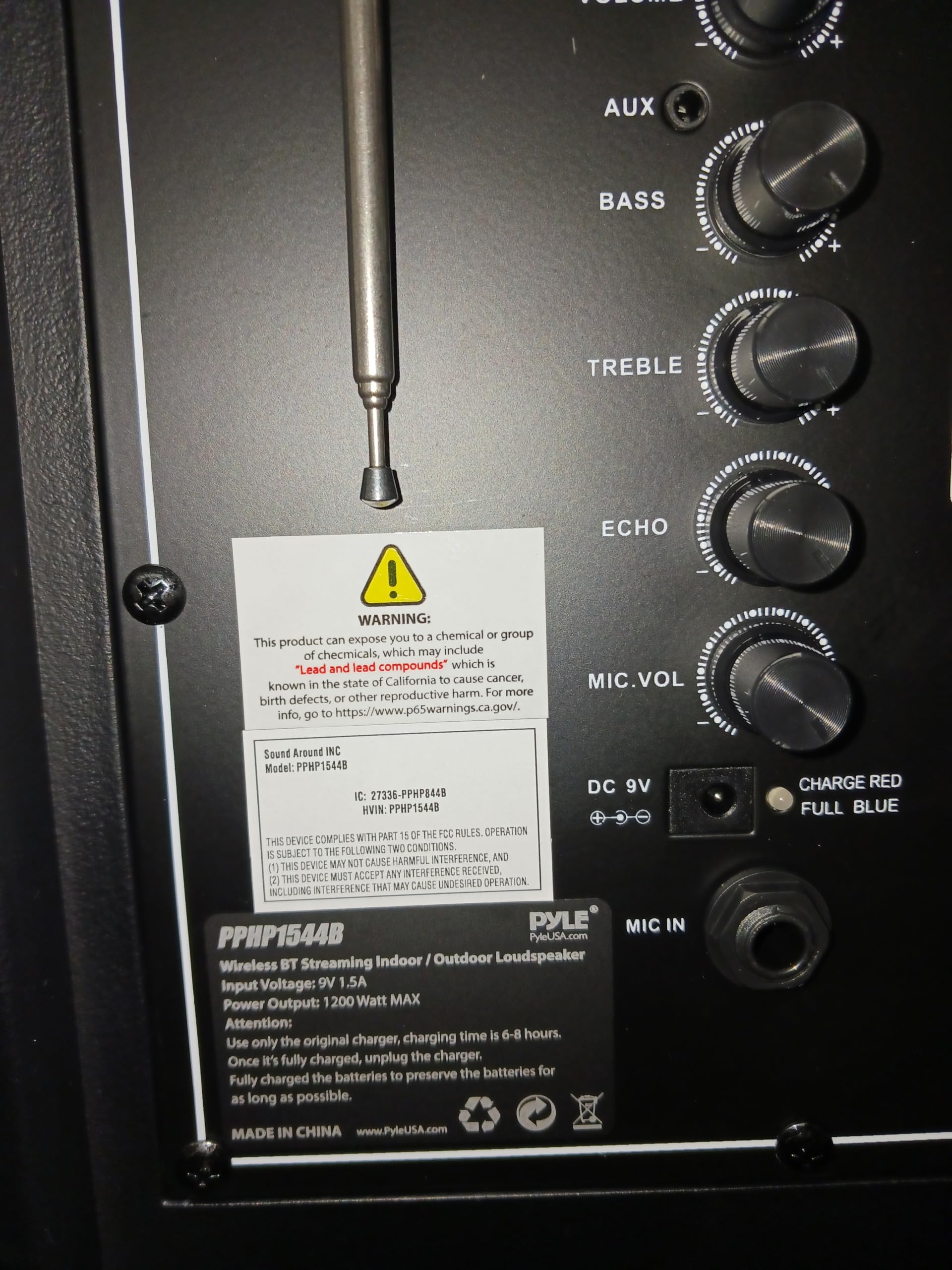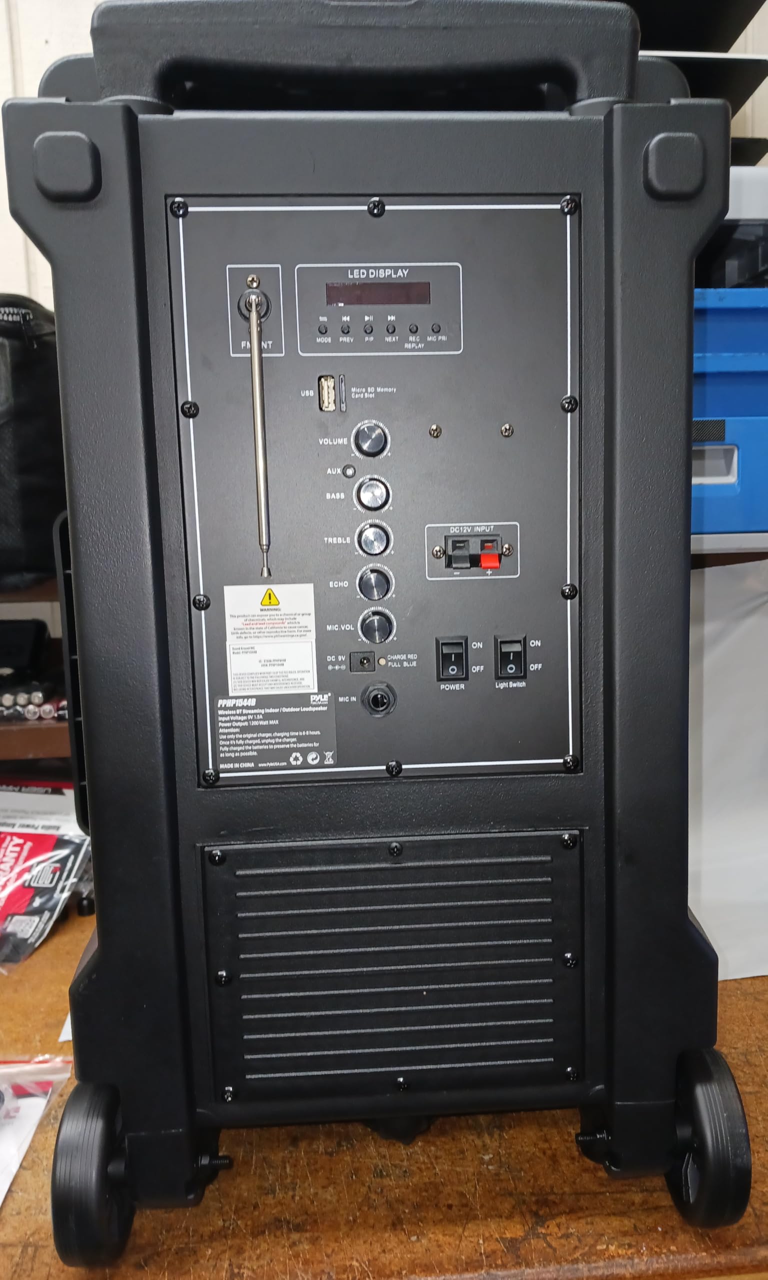 Details: Features: Portable & High-Powered Speaker System Rugged & Compact Speaker Designed for Portability Bluetooth Wireless Music Streaming Ability Multi-Color Flashing LED Party Lights Flashing LED Lights Bounce & Pulse to the Music Beat FM Radio with Digital Display Built-in Rechargeable Battery Recording Function Microphone Priority ‘Talk-Over’ Button Connect & Stream Audio from External Devices USB Flash Reader & Micro SD Card Reader MP3 Digital Audio File Support Aux (3.5mm) Input 1/4’’ -inch Microphone Input Rear Panel Button Control Center Mic Volume, Treble, Bass, Echo Adjustment Telescoping Handle & Rolling Caster Wheels For Indoor / Outdoor Use *Optional Power via DC 12V Input