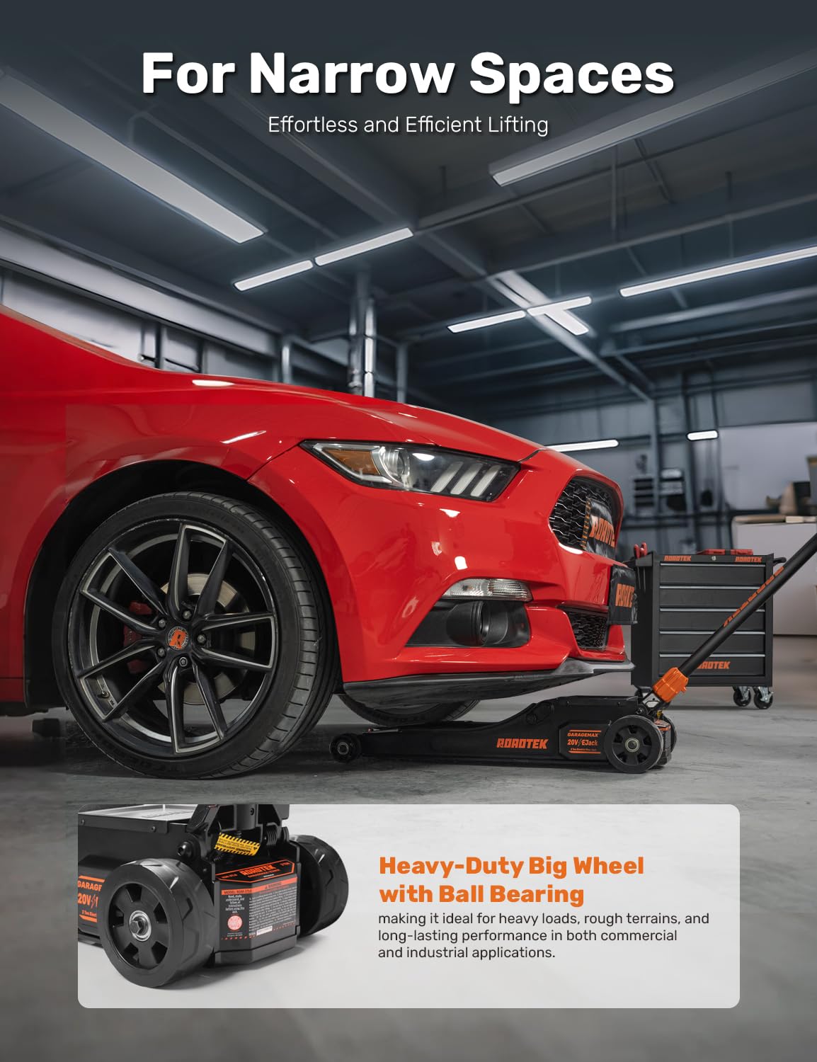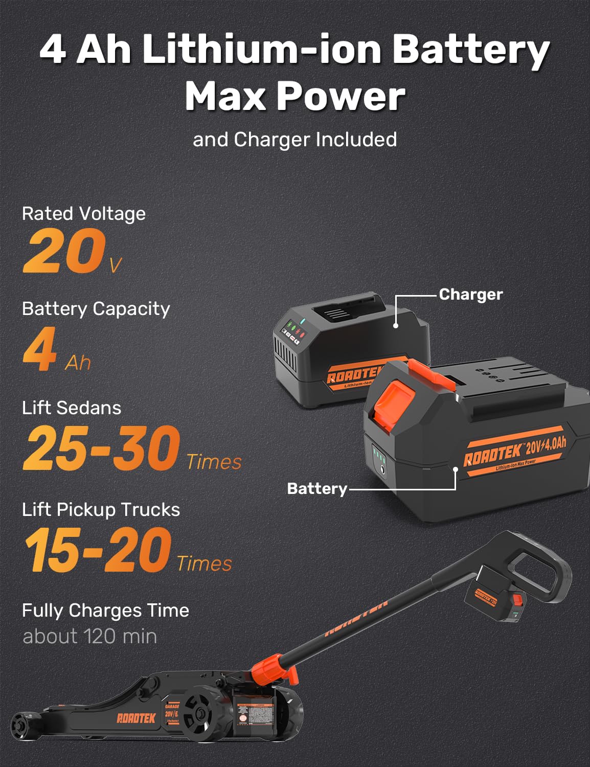 - 【One-Touch Electric Lifting】No pump anymore. ROADTEK 3 ton electric jack pairs a 20V lithium battery with a sealed Leak-Proof hydraulic system for one-button, effortless elevation. Perfect for home garage or workshop maintenance.