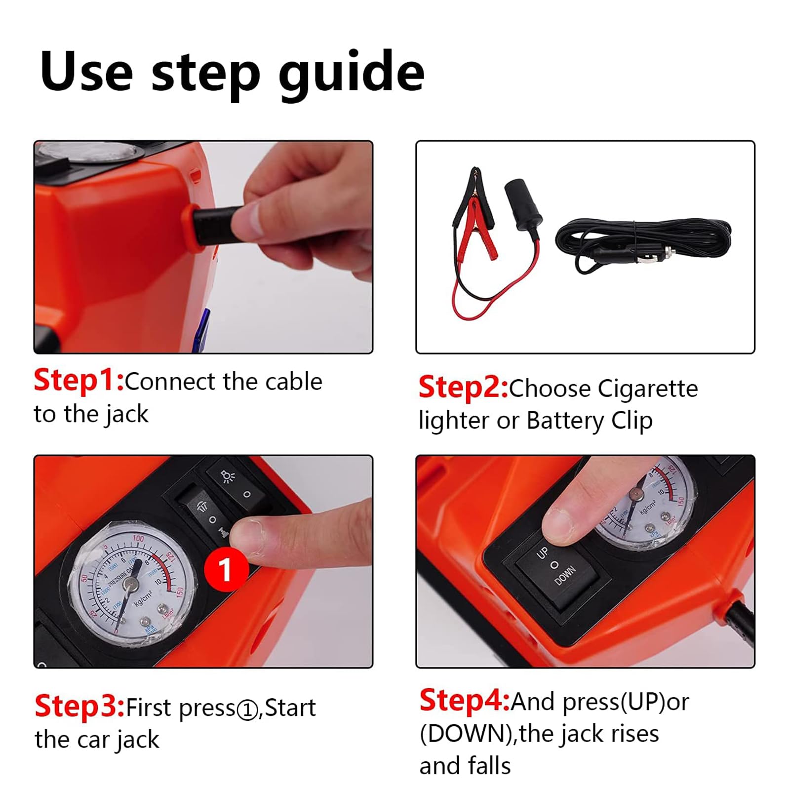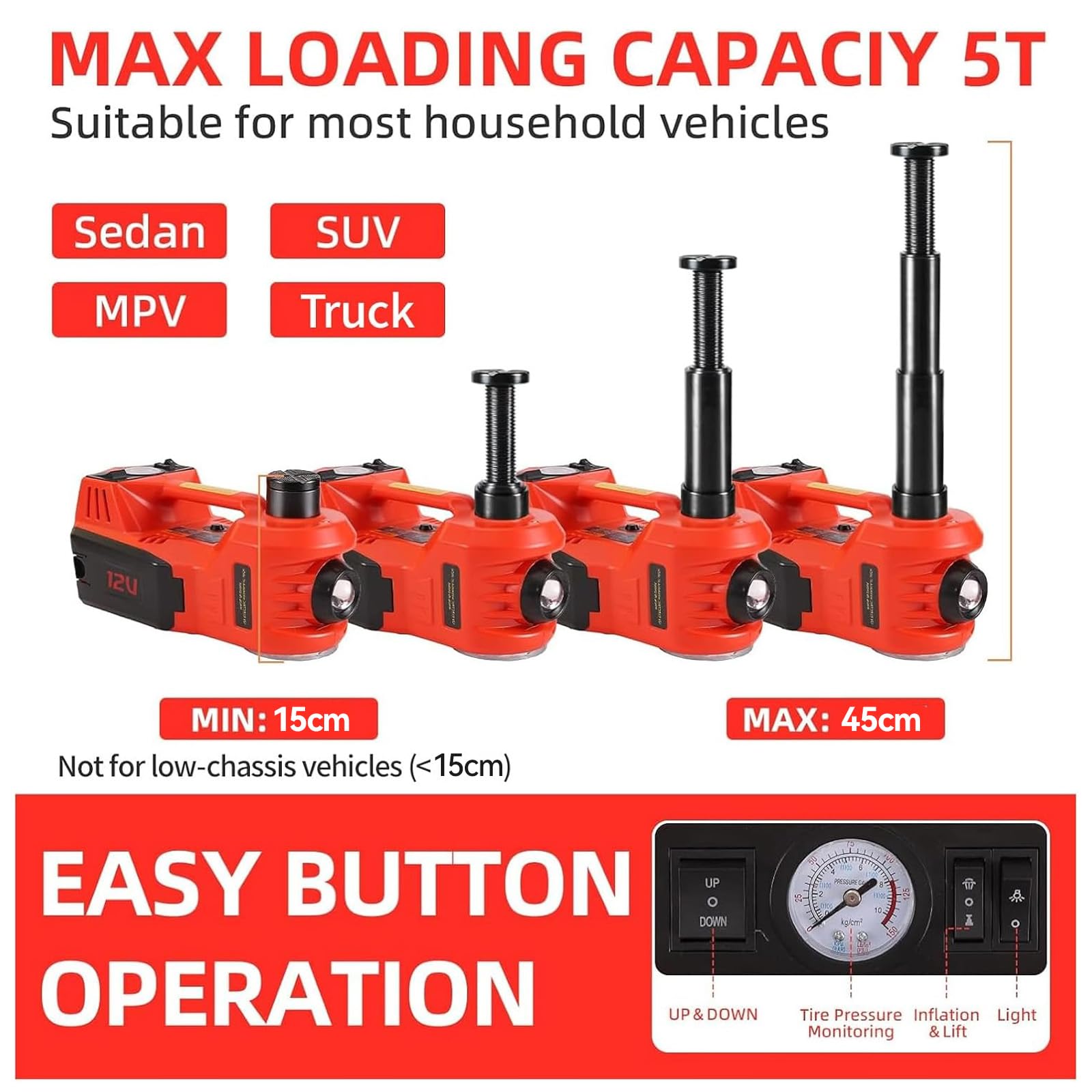 - Safe & Reliable: Electric jack uses a stable hydraulic system with automatic stop at max height or overload. Self-locking design prevents slippage during use. Includes pressure relief wrench plus LED and warning lights for safe tire work, even at night