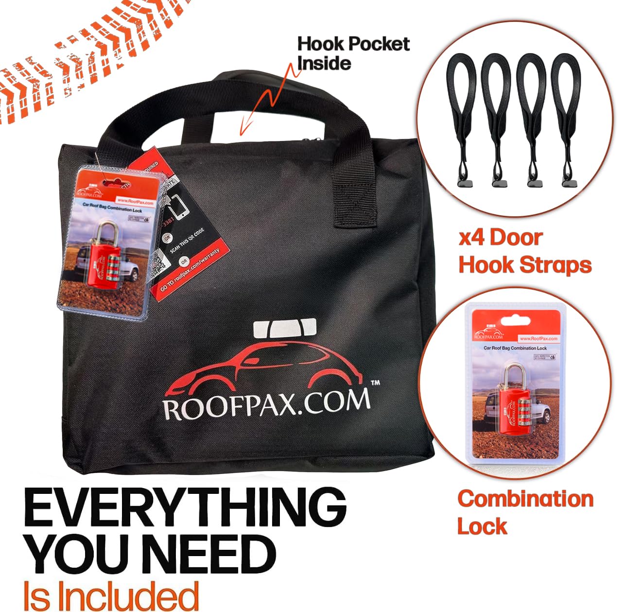 - EVERYTHING YOU NEED IS INCLUDED- Everything's covered in our 28 cft car cargo carrier package, 4 patented door hook straps/clips, a secured combination lock, and a robust storage bag for secure and easy car top luggage storage for your travels.