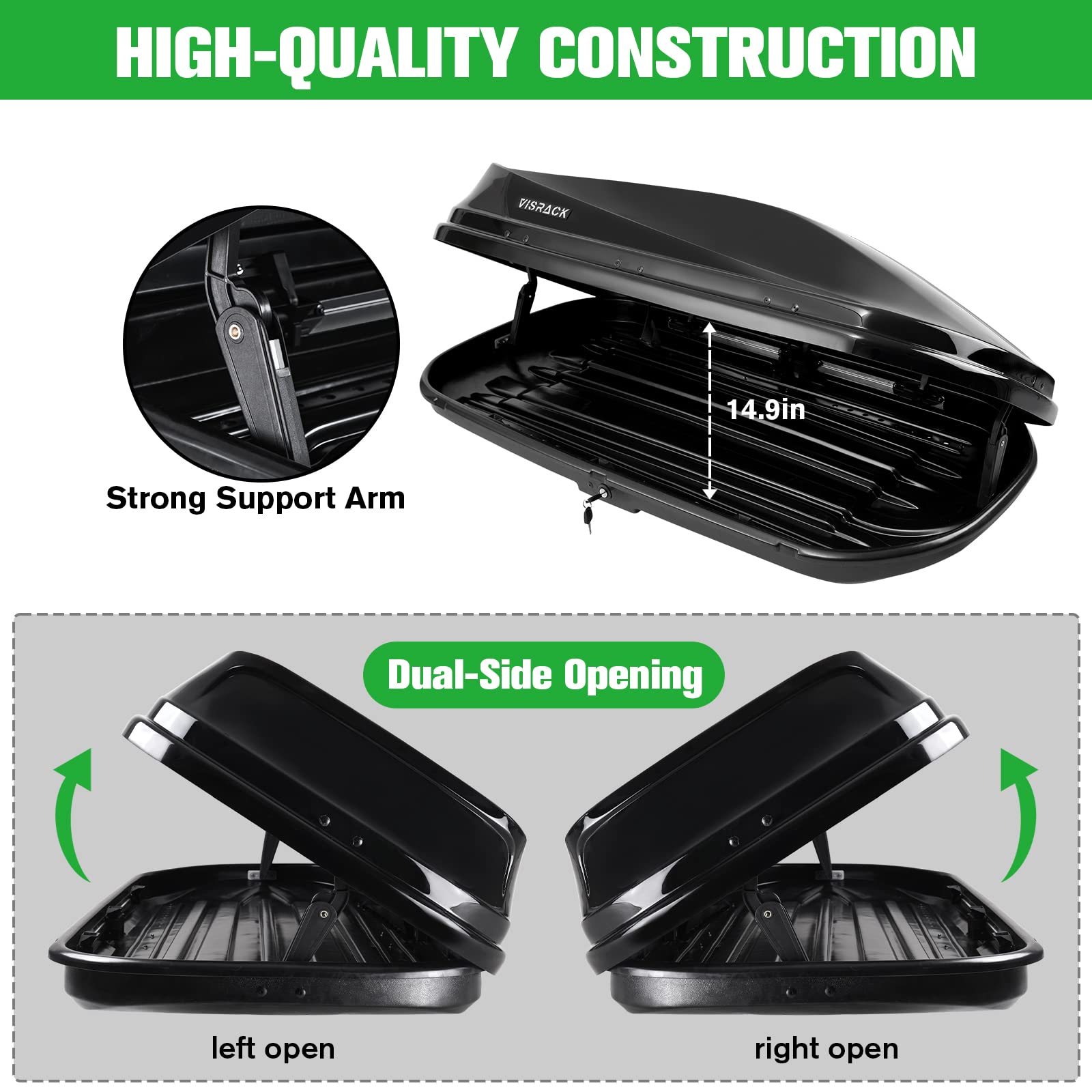 - 【14 Cubic Feet Cargo Box with Car Trunk Organizer】With the large capacity, the roof cargo box can help you securely carry 14 cubic feet worth of essentials, can increase vehicle cargo space without impeding on passenger comfort, more capacity, more pleasure.