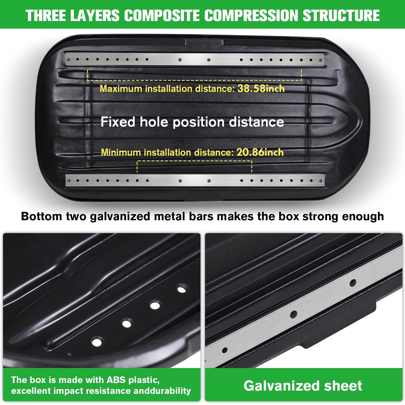 - 【Perfect for Road Trip】Take the cargo box to the park, the beach, the sports field, or any place you need to store. Works on all vehicles with rack, suitable for cars, vans, SUVs, etc. Sleek aerodynamic design to reduce drag and has less noise.This roof top storage box is universal fit for mounting to max 3 inches wide cross bar. Max. distance between bottom holes for installation: 38.58 inches. Min. distance between bottom holes for installation: 20.86 inches
