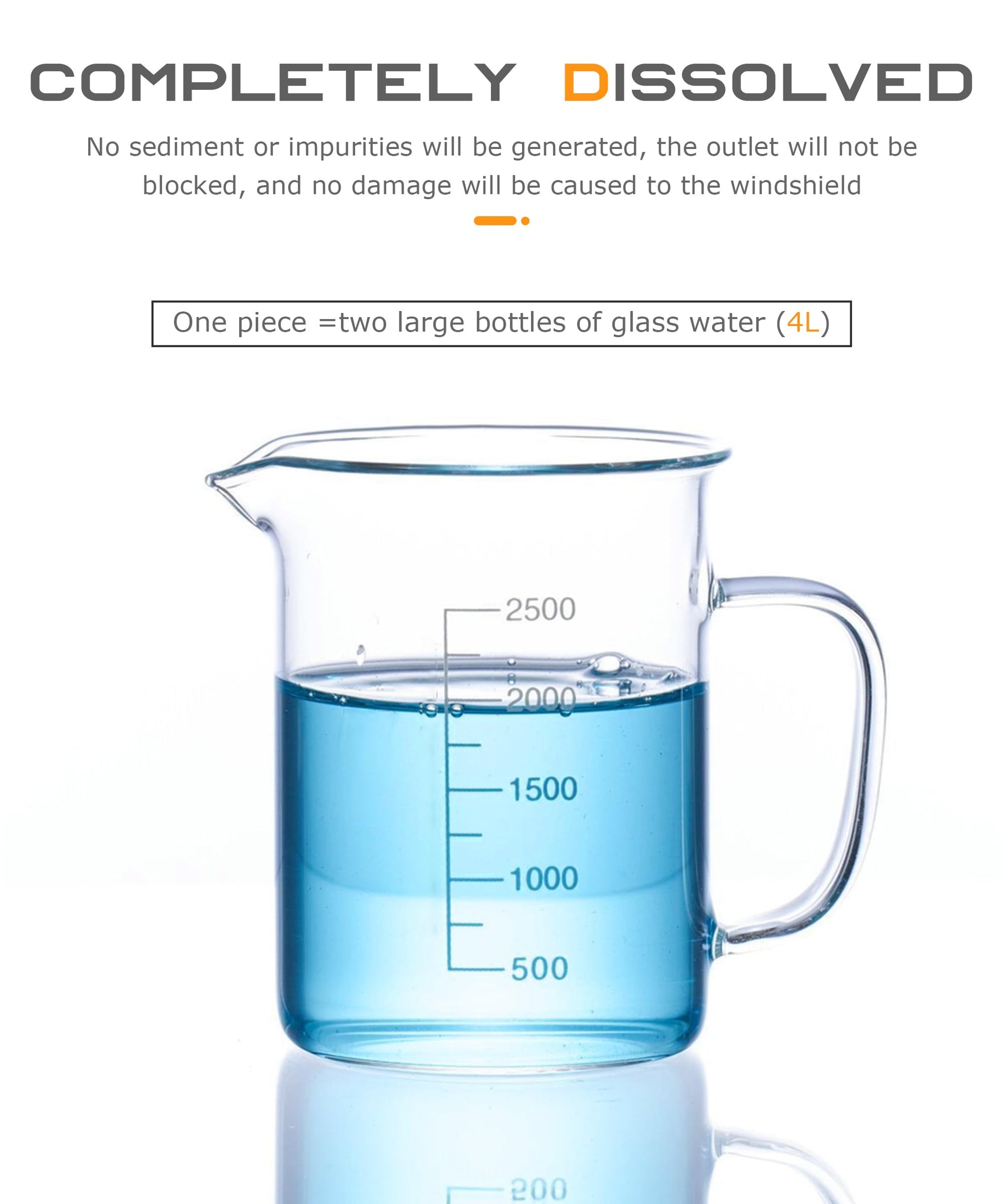 - [Complete Dissolution]:It takes about twenty minutes for the solid concentrated cleaning tablets to completely dissolve.No sediment or impurities will be produced,and the water outlet will not be blocked.It will not cause any damage to windshield,car paint,etc.
