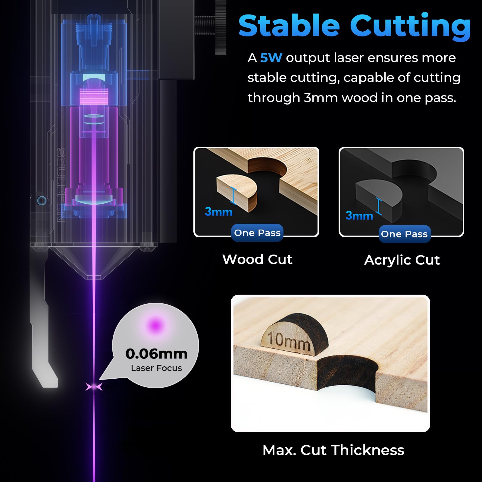 - ▶【All-in-One Engraving and Cutting】The iCube Pro laser engraver adopts a 5000mW diode laser, featuring an ultra-fine 0.06mm laser focus, which delivers exceptional cutting penetration and engraving precision. It can cut soft wood up to 10mm thick and black acrylic up to 6mm thick. Of course, in addition to engraving on wood, leather, and bamboo, it can also engrave on ceramics and stainless steel (it is recommended to blacken the surface for more remarkable engraving results).