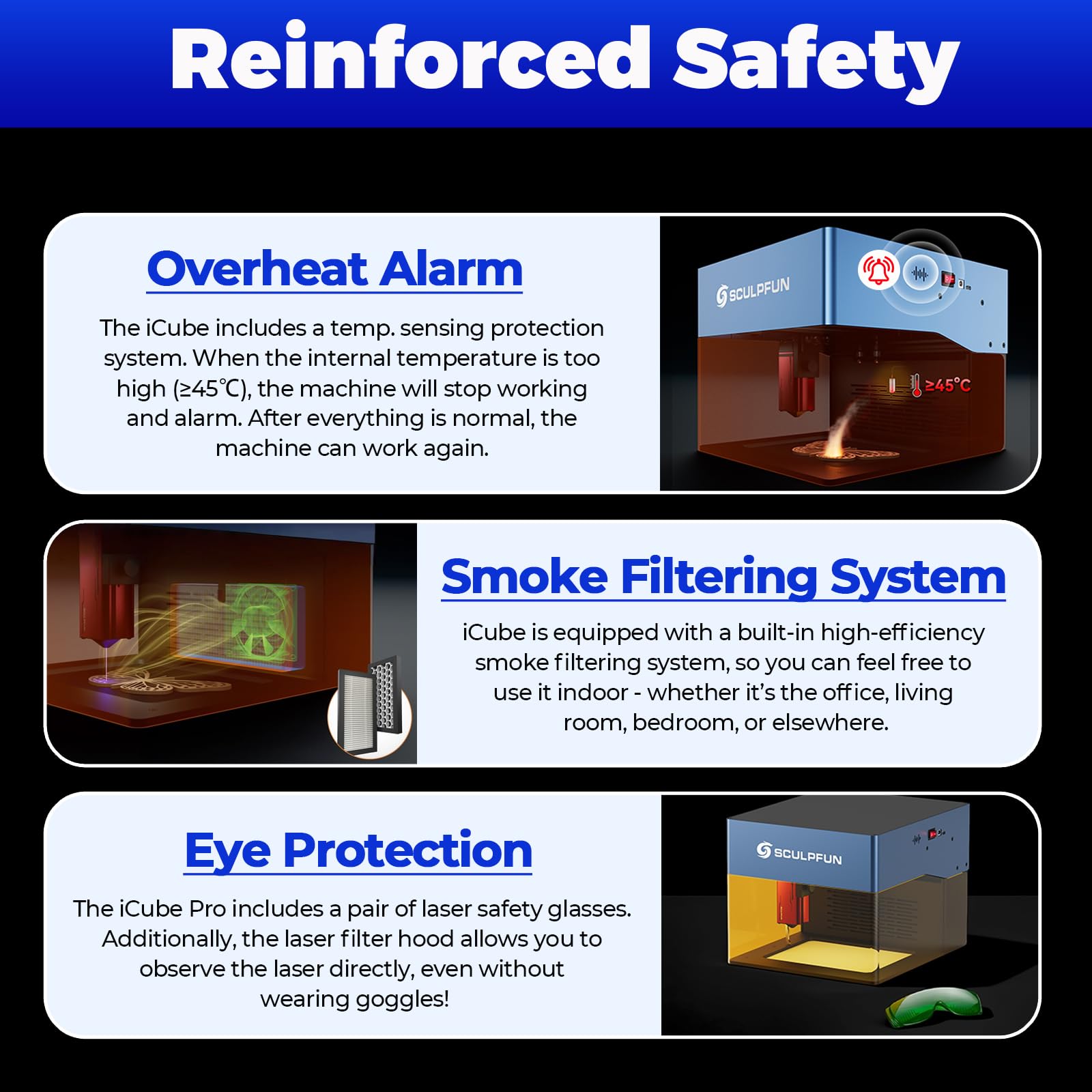 - ▶【Built-in Smoke Filtration System】The iCube Pro laser cutting machine comes with a built-in smoke filtration system, meaning it can effectively filter the smoke generated during engraving and cutting without the need for a smoke exhaust enclosure. This allows you to freely engrave and cut in offices or homes, eliminating pungent smoke and letting you enjoy the fun of engraving!