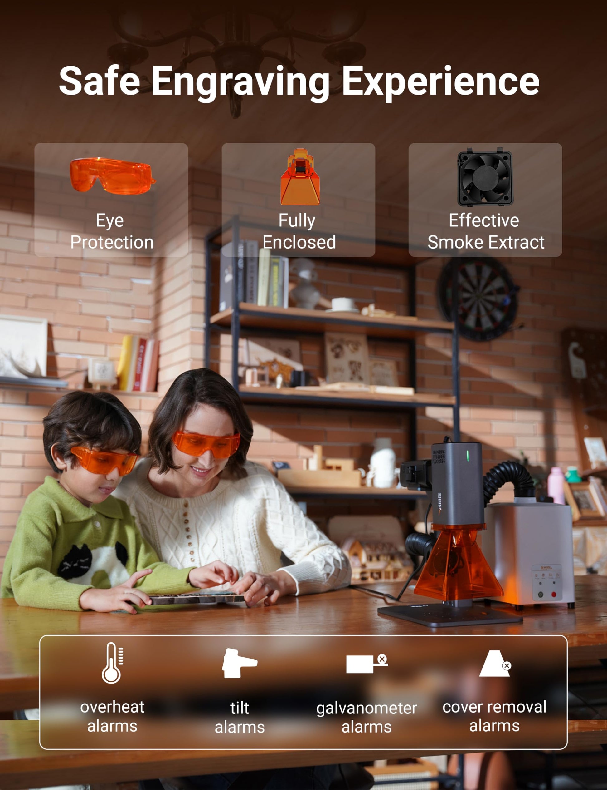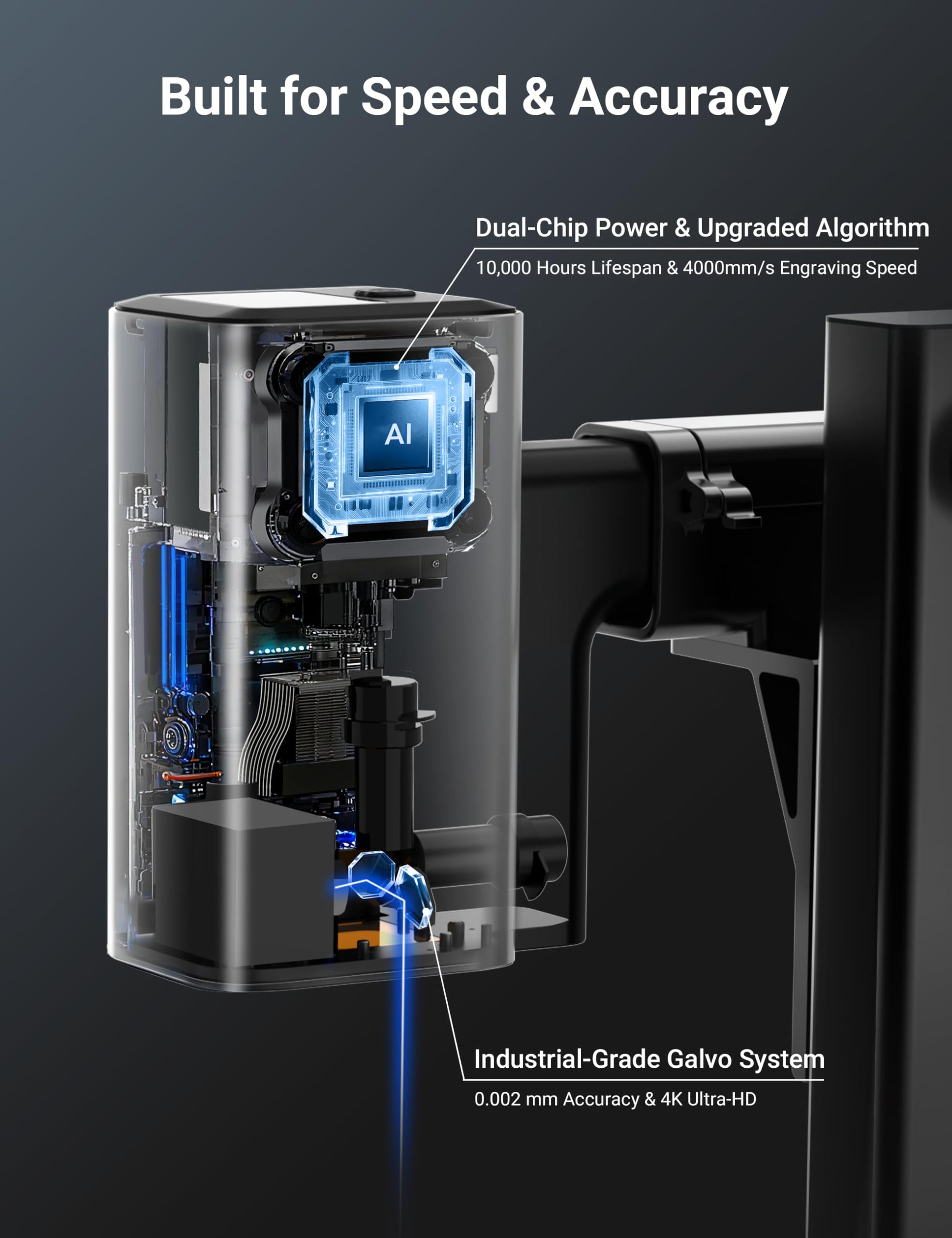 - ⚡ Faster Engraving with Upgraded Algorithm – This laser engraver features an industrial-grade galvo and optimized motion algorithm, reaching 4000mm/s for faster engraving. Perfect for DIY projects, custom gifts, or small business orders with precise results.