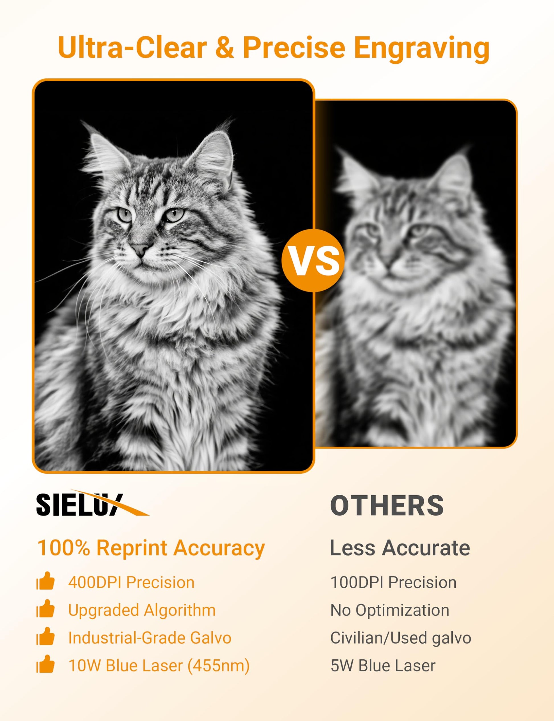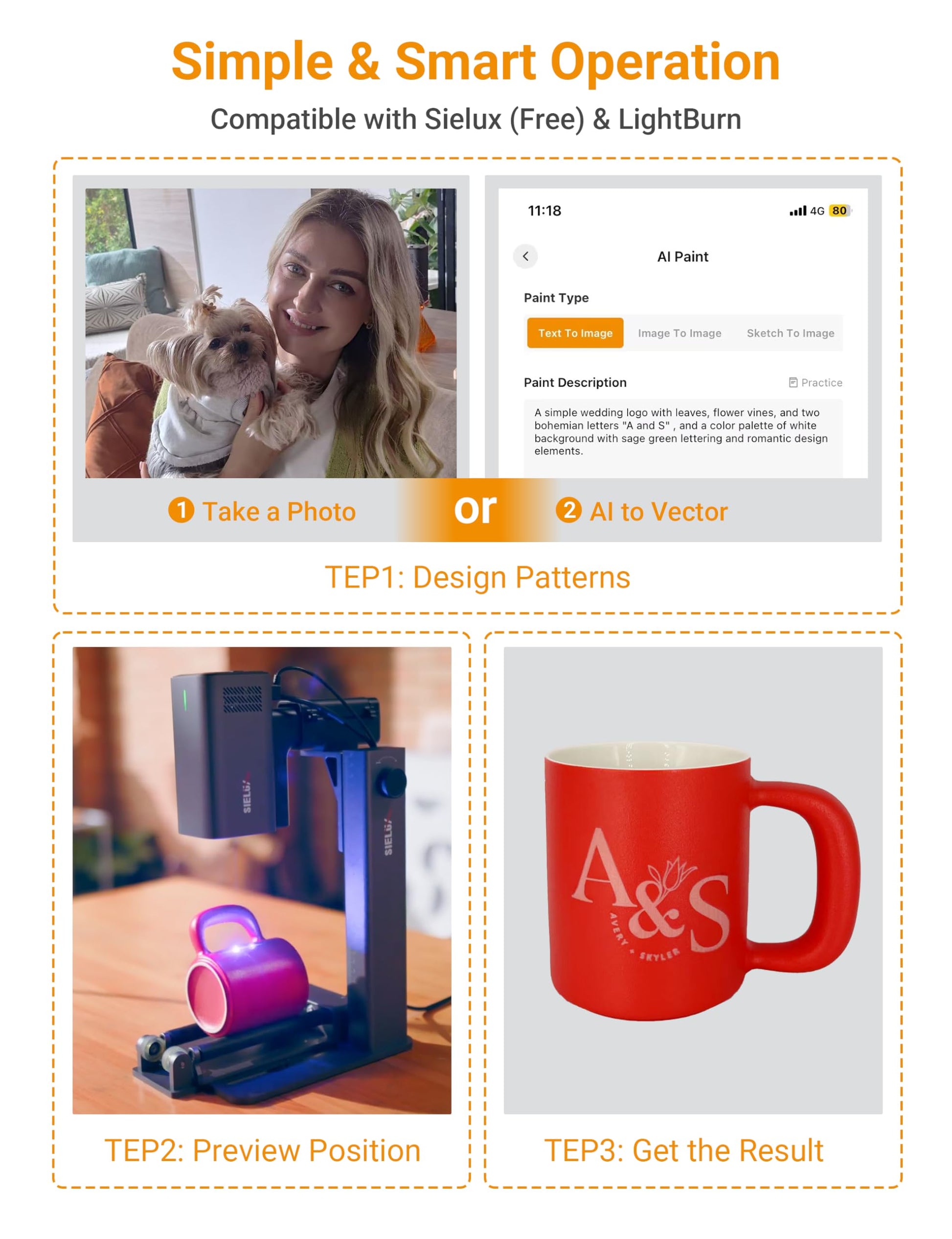 - 📱 Beginner Friendly -Seamless Control on Any Device : use the SIELUX App for quick setup and one-tap engraving, refine designs on iPad, or run production through PC/LightBurn. From idea to finished product, enjoy a smooth studio-to-floor workflow without the learning curve.