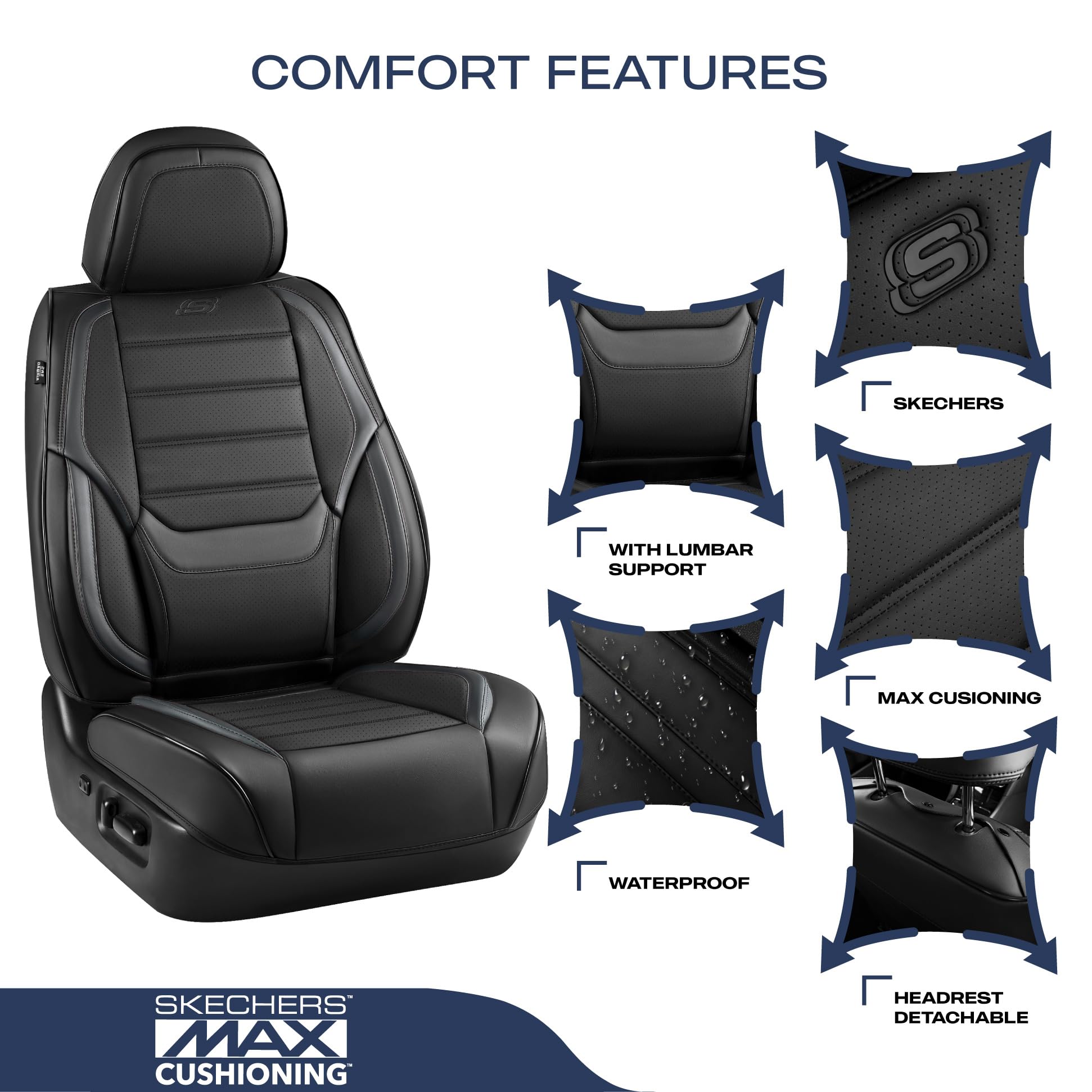 - MAX CUSHIONING:The seat coversImitation Skechers Leather Craftsmanship, feature the same Max cushioning technology as Skechers athletic shoes, with extreme padding for superior comfort and support. Enhanced padding provides long-term support and relieves pressure-related stress while protecting your car seats from spills, stains, pet hair, and harmful UV rays. Designed to be fade-resistant, gentle to the touch, these seat covers are waterproof, breathable, and durable for years of reliable use.