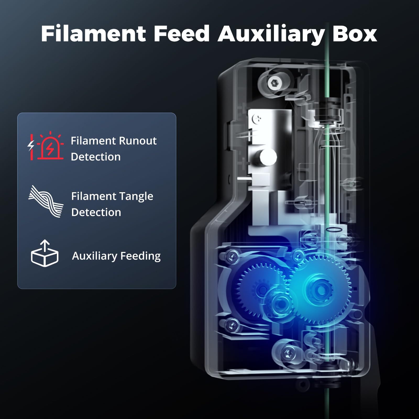 - Auxiliary Feeder: The Smart Auxiliary Feeder System not only assists with smooth filament feeding, but also features tangle detection and clog detection to ensure uninterrupted printing. It actively monitors filament flow and prevents issues before they affect your print.