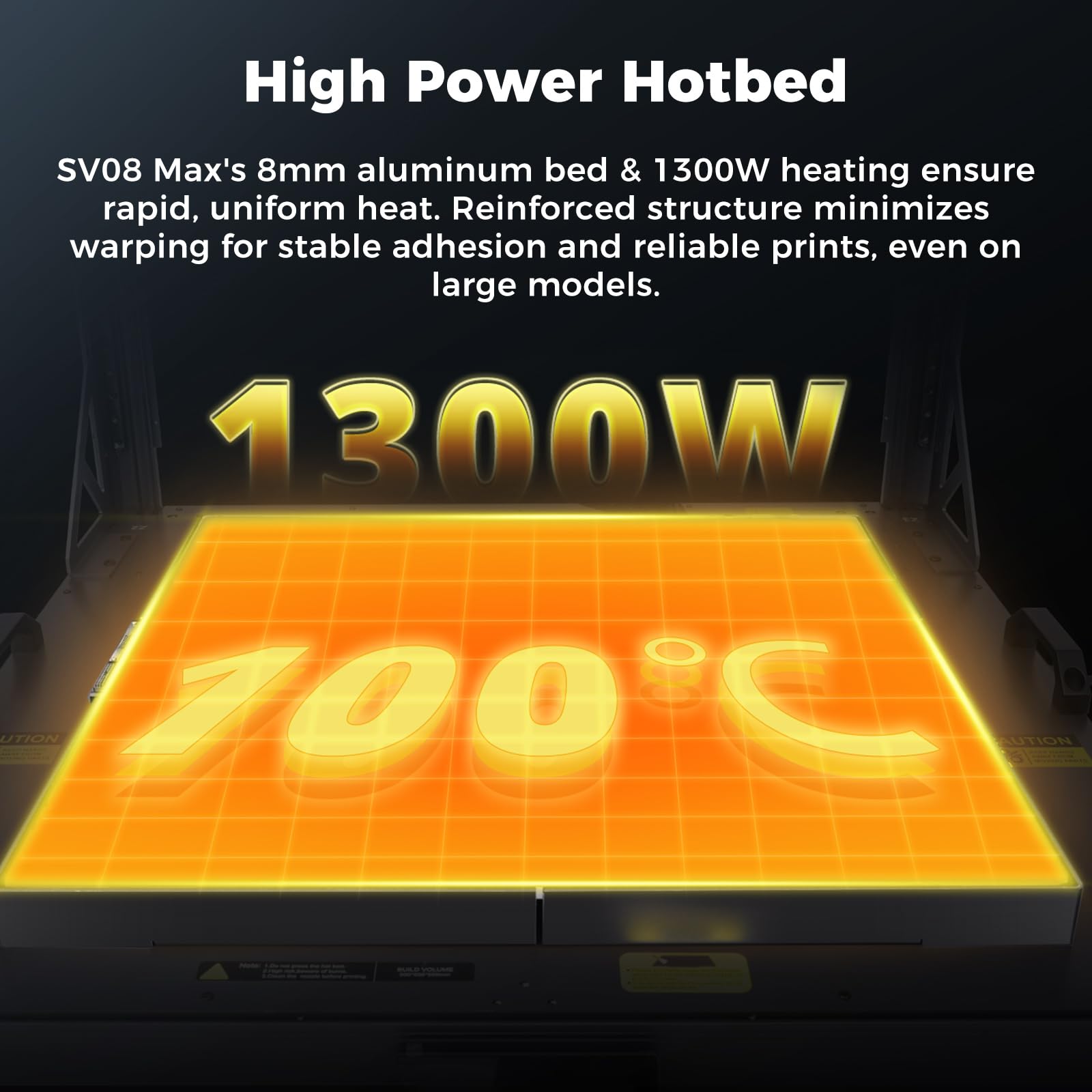 - Thickened Hotbed: Equipped with a 8mm thick aluminum bed and 1300W of power, the SV08Max’s hotbed delivers rapid and even heating across the entire surface. The reinforced structure minimizes warping, ensuring consistent adhesion and reliable prints — even on large models