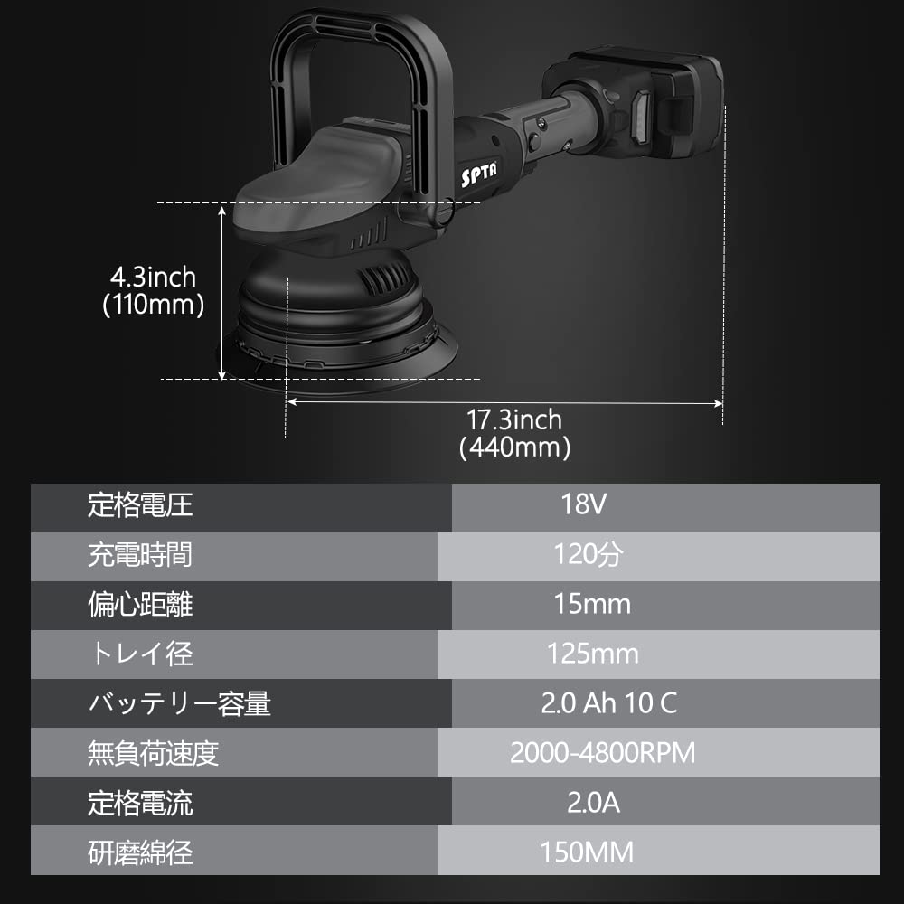 - 7 Variable Speed & Powerful 18V 4.0Ah Battery - SPTA Orbital Car Polisher is equiped with 7 variable speeds allows users to set speed from 2000-4800 orbits per minute for car waxing and buffing. 2Pcs 18V 4.0Ah battery can support above 60 mins working time after full charge for extending working time both indoors or outdoors, It is a standard-sized paint correction tool that has been specially designed to be economical and provide detailing freedom